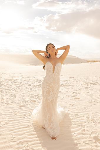 This stunning mermaid style bridal gown, the Almada, is a beautiful and timeless choice for your special day. The fitted bodice is adorned with delicate lace detailing and delicate beading, while the skirt flows to a dramatic train.