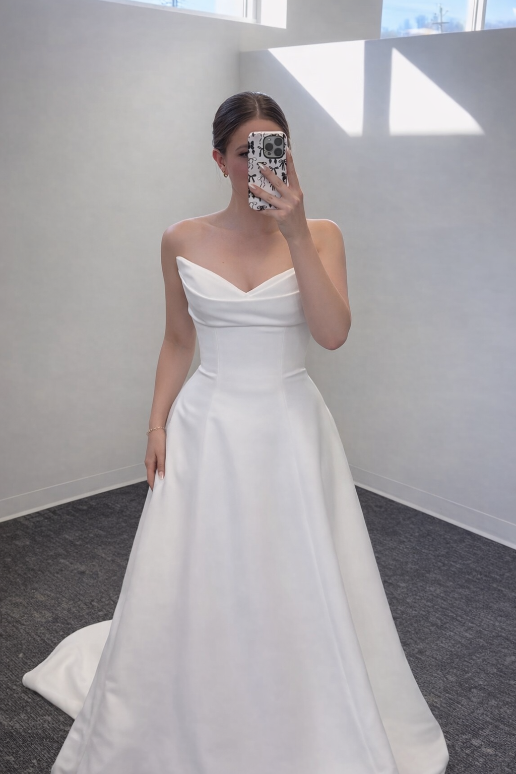 Features a stunning no waist seam a-line silhouette in dove satin. Chic and timeless. Bridal size 10.