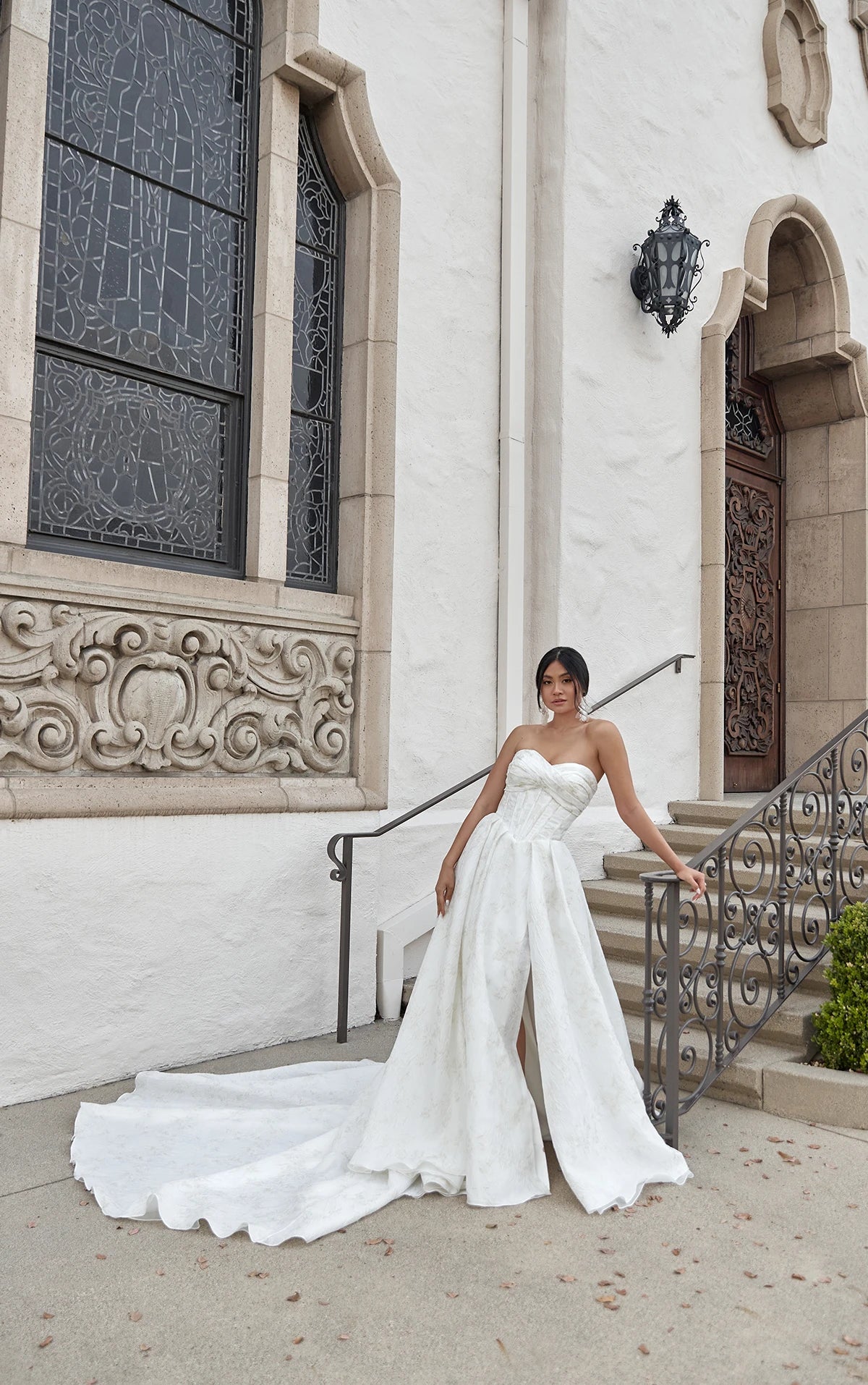 A modern masterpiece, Style D4080 is a runway-worthy strapless wedding gown made for the bride with fashion-forward style. The draped sweetheart neckline frames the corset-style strapless bodice and resolves into a petite row of fabric-covered buttons that meet a Basque waistline. Forming the refined A-line silhouette, soft pleats in patterned metallic jacquard extend from the waist, discreetly concealing two functional side pocket. Opening for a thigh-high leg slit, this elegant wedding gown makes a dramatic statement down the aisle. This wedding gown is available in plus size.