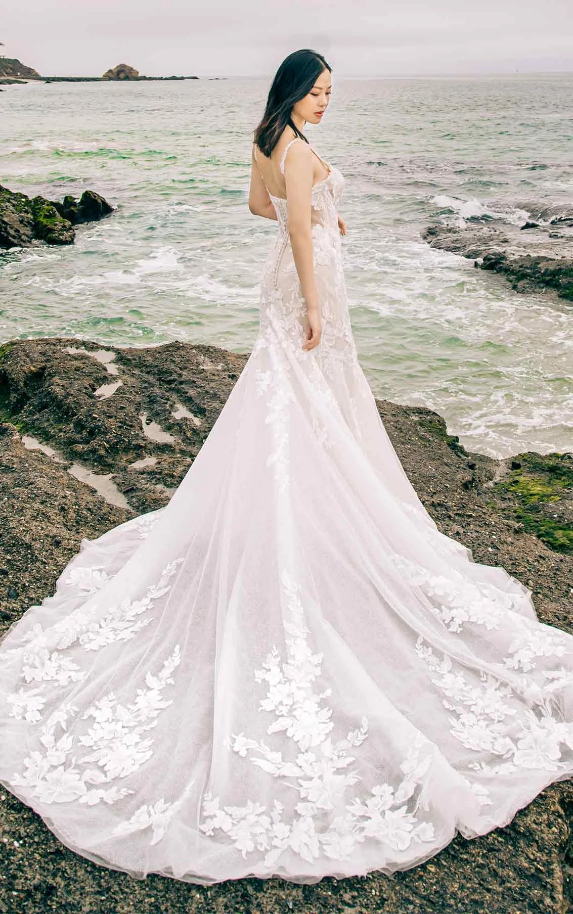 Style D3393 is the elevated bridal look fit for a queen. Large-scale floral appliques are thoughtfully and sparsely placed throughout the gown, putting every detail of the lace on full display. The plunging sweetheart neckline is a nod to classic bridal beauty, with illusion tulle providing all-day support. Floral details decorate the wide-set straps for a truly head-to-toe floral masterpiece. Sheer elements are used throughout the bodice and all through the back to add an ultra-modern, sexy look highlighting the intricate floral lace. The skirt flares out below the hips for a show-stopping flourish, with layers and layers of tulle creating a regal, voluminous skirt worthy of your grand entrance.