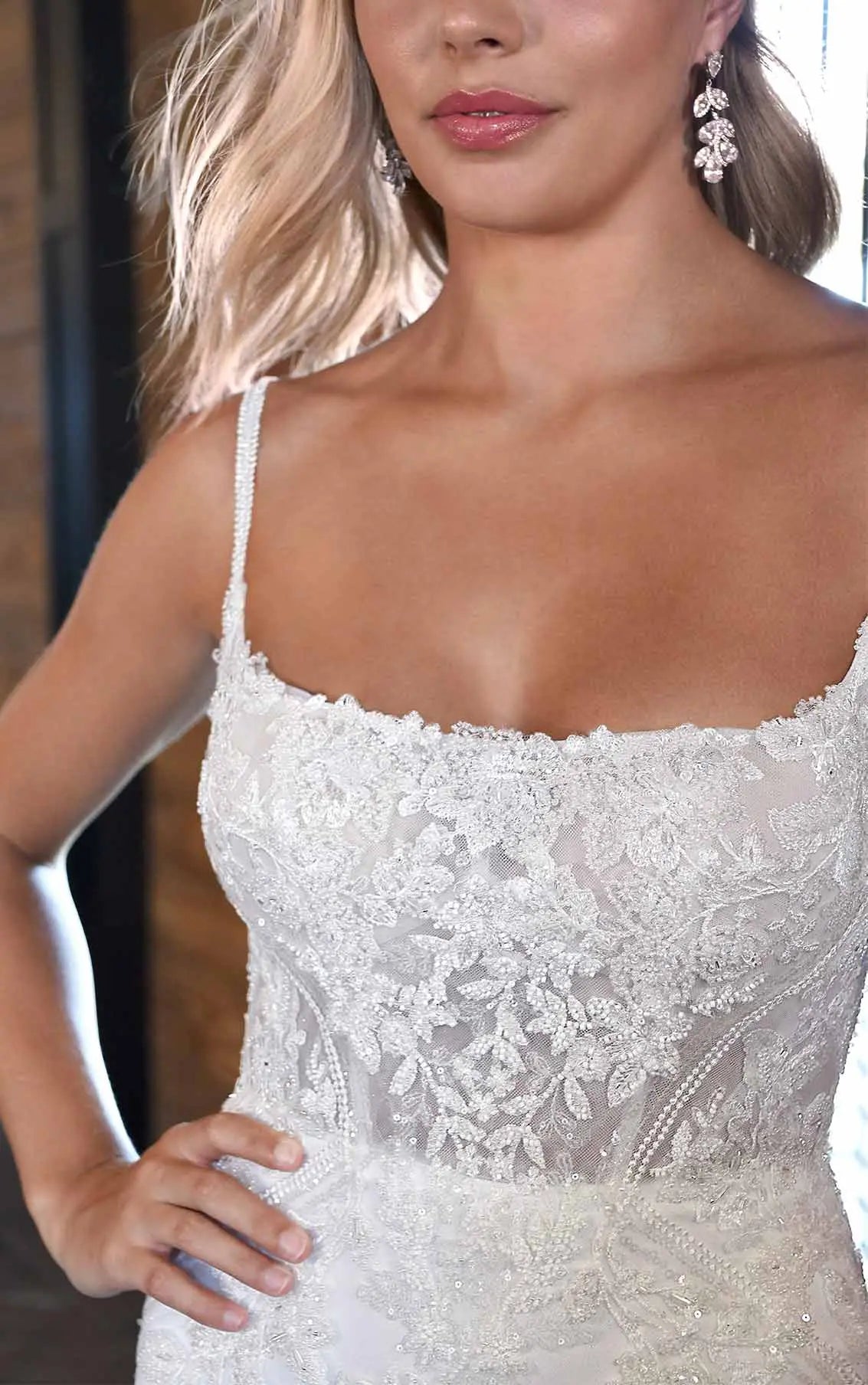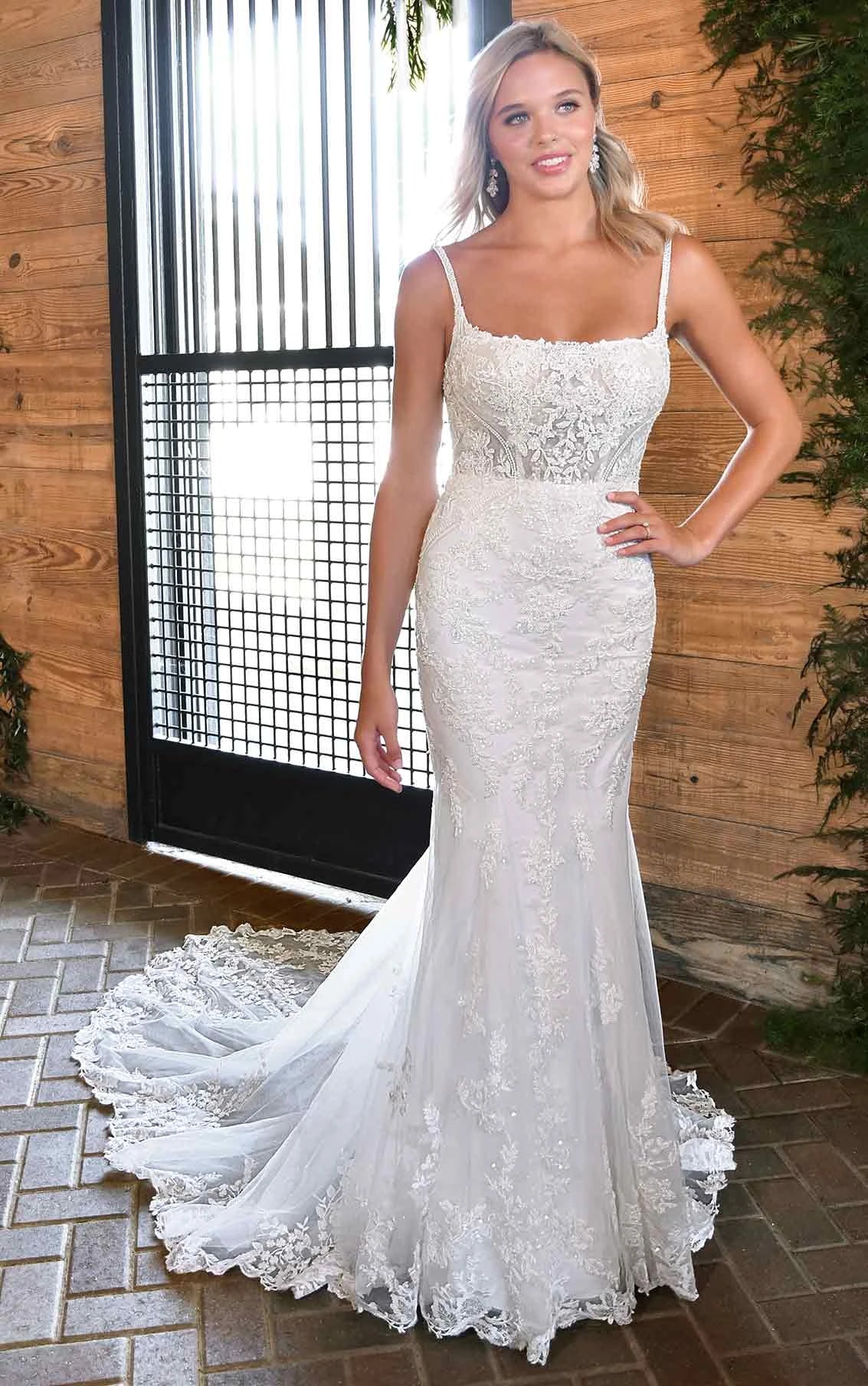 For the fashionable bride with a love for all things vintage, Style D3407 is the perfect mix of timeless and modern. The square neckline gives this wedding dress an instant retro feel, calling on the glamour of Old Hollywood. The bodice is so beautifully textured, with layers of floral appliques and sparkling sequin details adding dimension throughout the gown. The chic fit-and-flare silhouette effortlessly hugs the body’s natural curve, flaring out into a subtly voluminous skirt below the waist. For an elegant bridal finish, the full train is adorned in stunning lace appliques, complete with an organic edge hem.