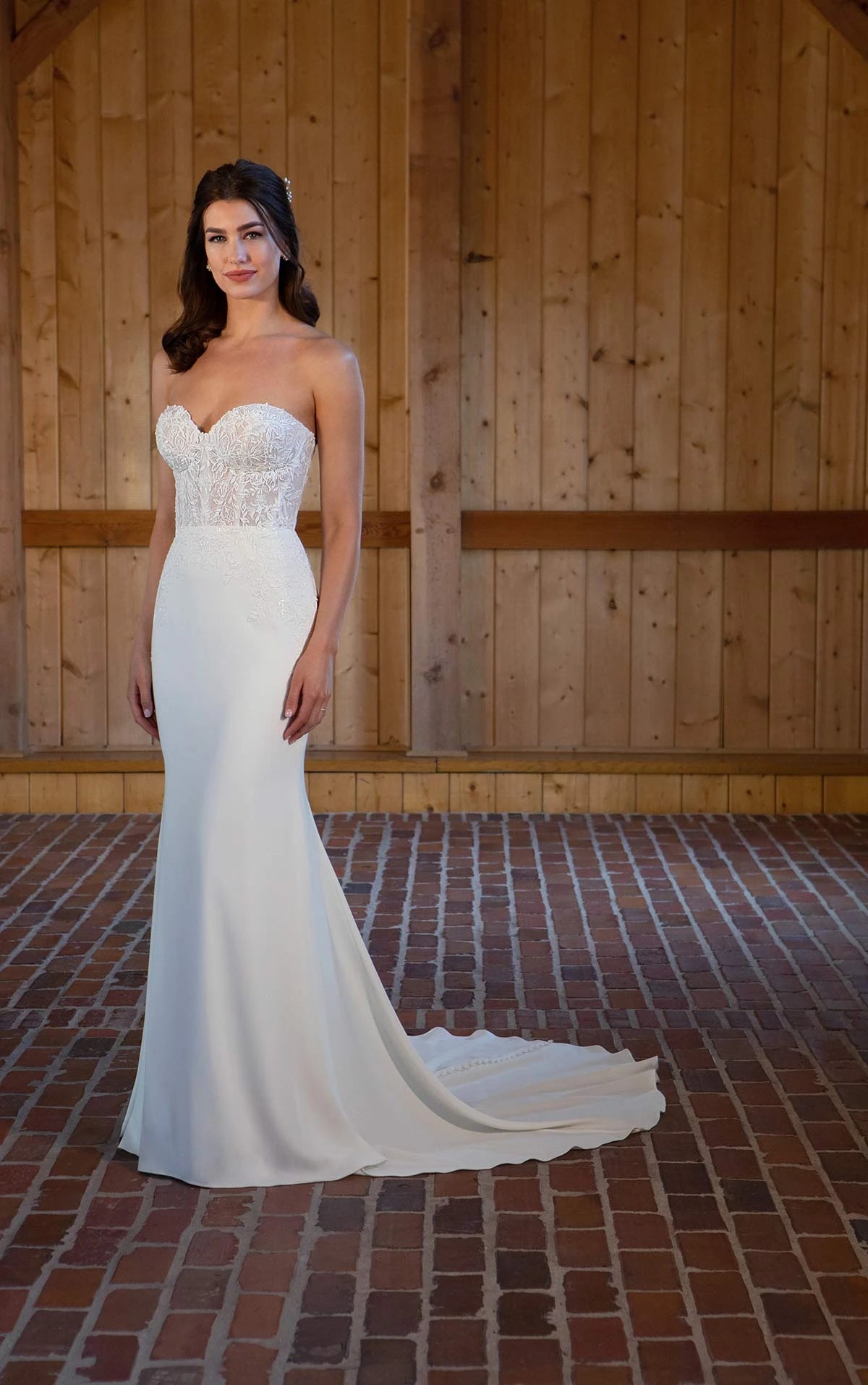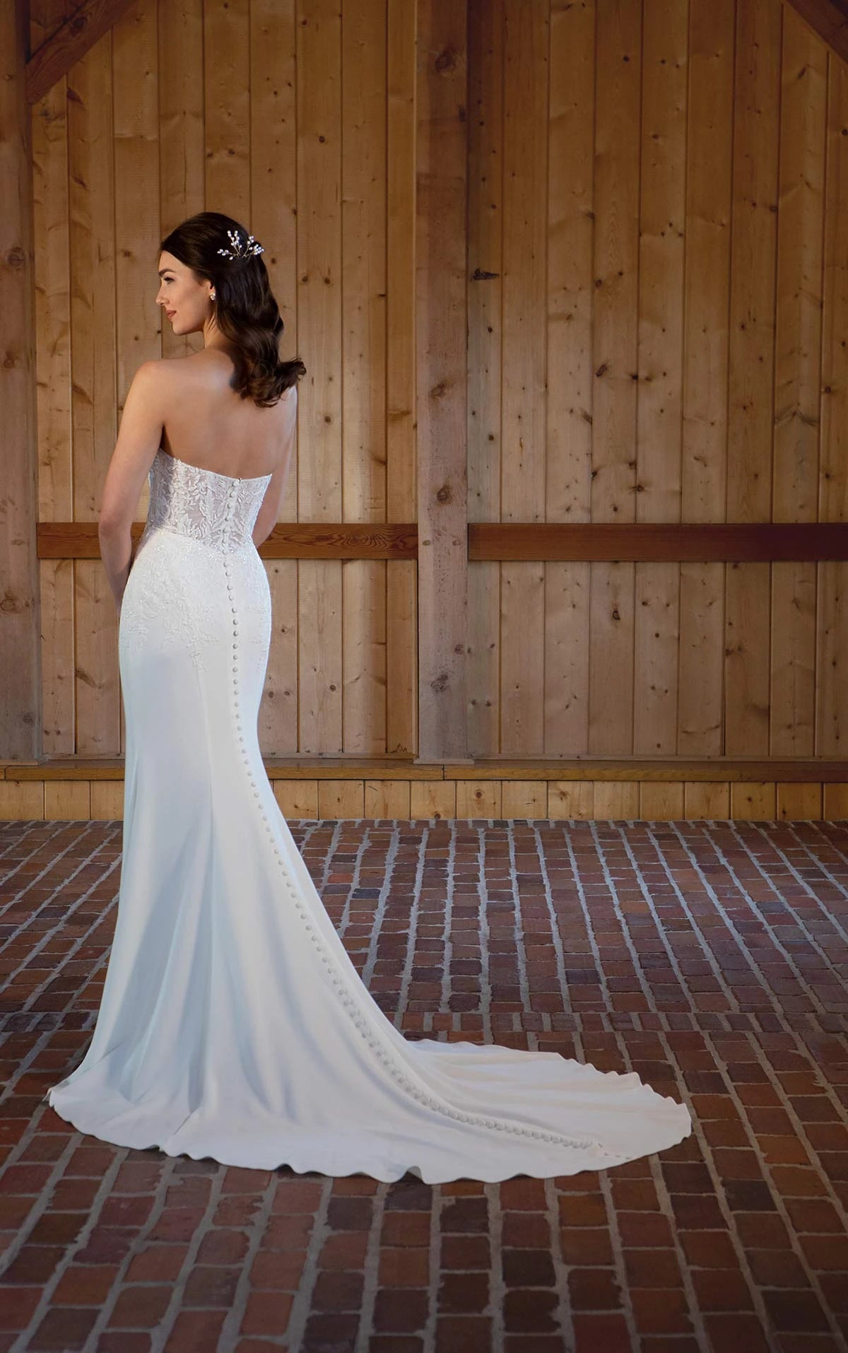 Elegant vintage-inspired elements meet modern luxe minimalism in this glamorous wedding dress for the cosmopolitan bride. Style D3509 features a striking strapless bodice of floral lace with a contoured sweetheart neckline. The semi-sheer lace gives a sexy hint of the corset-style boning underneath, with a touch of beaded sparkle on top. Delicately blending into the luxurious matte crepe fabric, the bodice and waist meet at the natural waist to create a flattering column silhouette. In a final gorgeous detail, elegant fabric-covered buttons complete the back detail from the top of the bodice to the edge of the sweeping train. Sophisticated, tasteful and oh-so-chic this gorgeous wedding dress was made for the ultra-stylish bride.