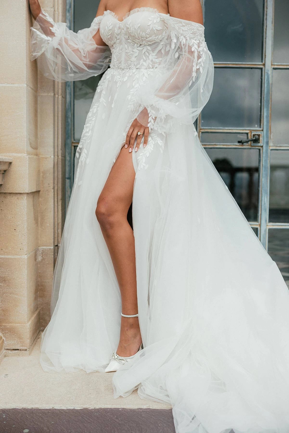 Step into a fairytale romance with Style D3787’s elevated designer boho style. Detachable, sheer off-the-shoulder blouson sleeves add volume and movement, gathering at the wrist to highlight the high-fashion raw tulle edge. The translucent strapless sweetheart bodice reveals the intricate corset construction underneath with a small row of fabric-covered buttons in the back. From the waist, a gauzy sea of layered tulle accented by leafy lace billows into a romantic soft A-line skirt, opening in the front for a high side-slit that adds movement and allure to this modern boho wedding gown.