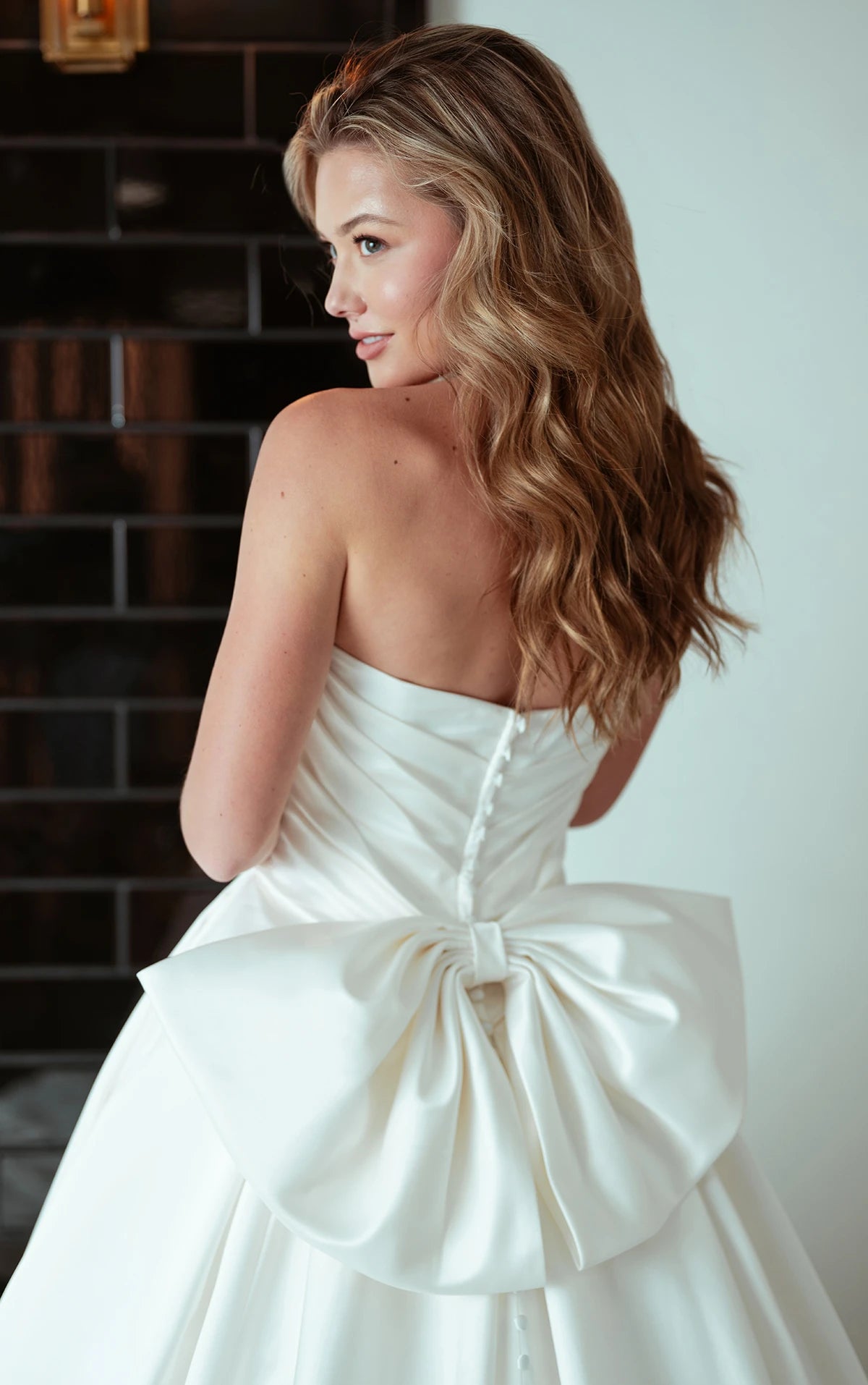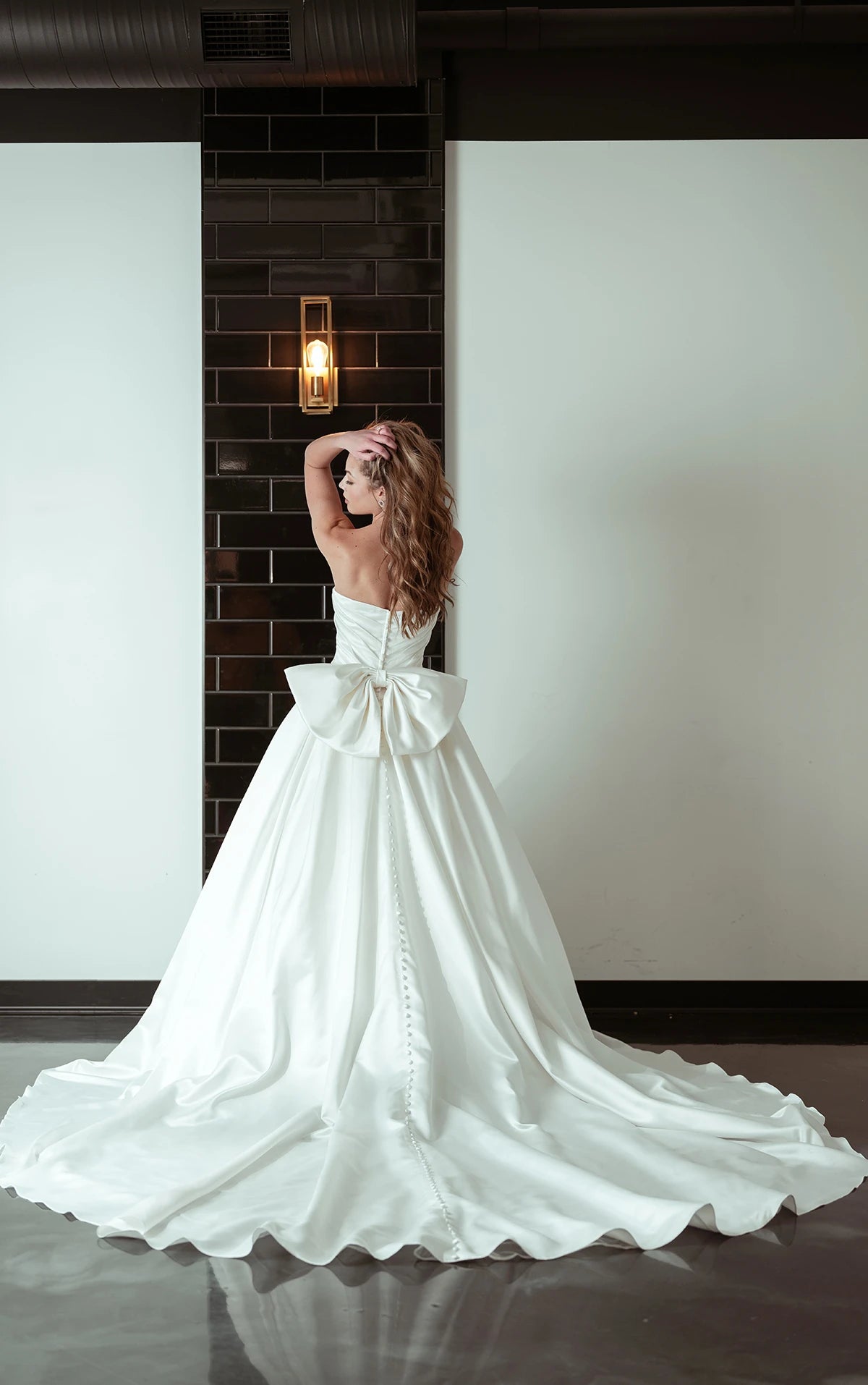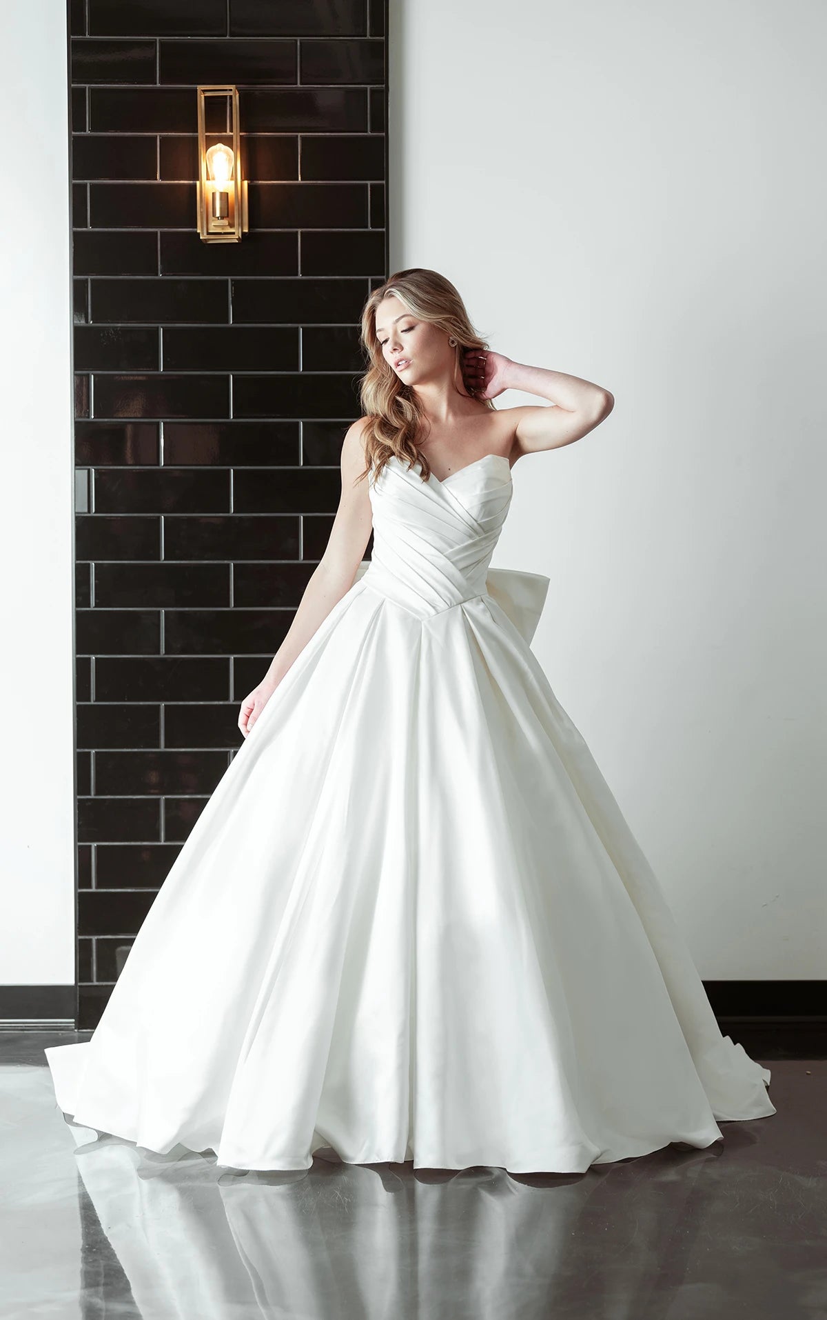 Modern and romantic, Style D4109 is a glamorous satin princess wedding dress ready for the runway or the aisle. An intricately draped bodice features a flattering sweetheart neckline to accentuate the impeccably tailored bodice. In the back, the Basque waist and an oversized detachable bow adds a contemporary fashion-forward touch. Majestically unfolding from waistline pleats, the voluminous ballgown skirt conceals two functional hand pockets and a dramatic long train. With contemporary details and timeless romance, this modern wedding gown makes a showstopping statement down the aisle. This wedding gown is also available in plus sizes and French blue.