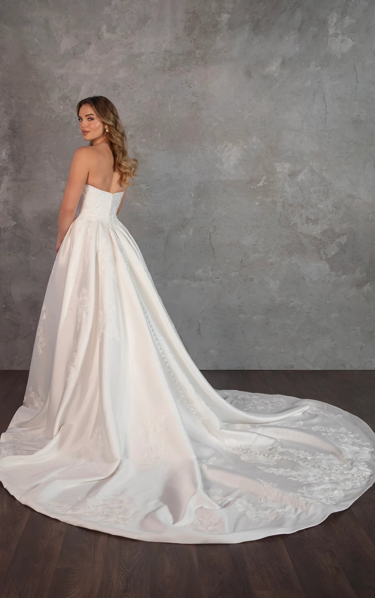 A modern take on classic bridal glamour, Style D4265 exudes timeless elegance with its striking ballgown silhouette and luxurious Mikado fabric. The strapless bodice showcases a chic scooped cat-eye neckline, with expertly placed seaming that highlights the natural hourglass shape. From the defined Basque waist, sculpted pleats unfold into a voluminous ballgown skirt, creating a breathtaking, regal effect. A row of fabric-covered buttons trails from the bodice to the hem of the dramatic train, adding a touch of refined sophistication. Designed for the fashion-forward bride, this clean and structured gown makes an unforgettable statement.