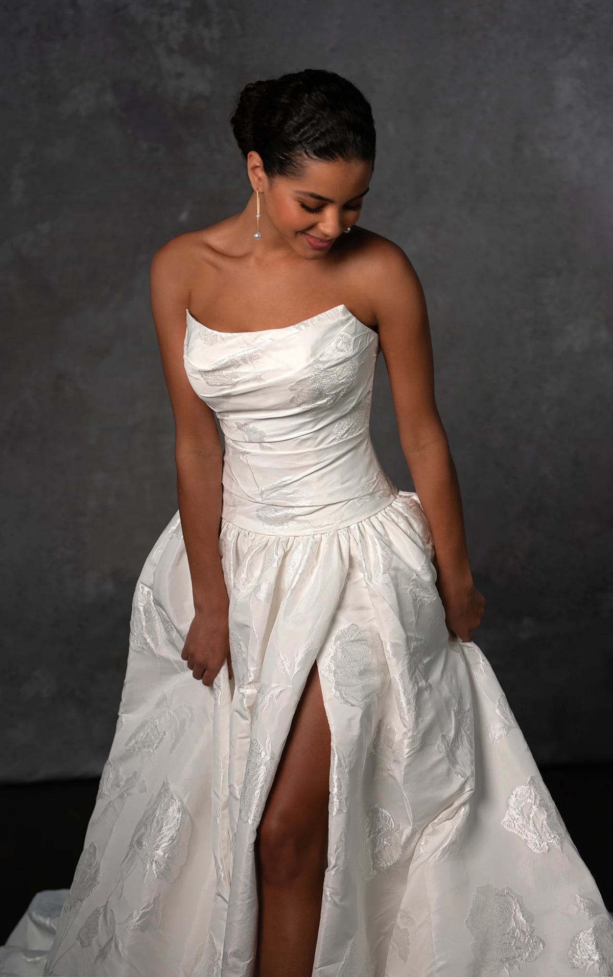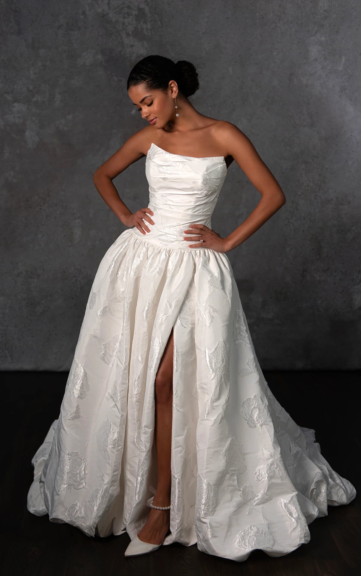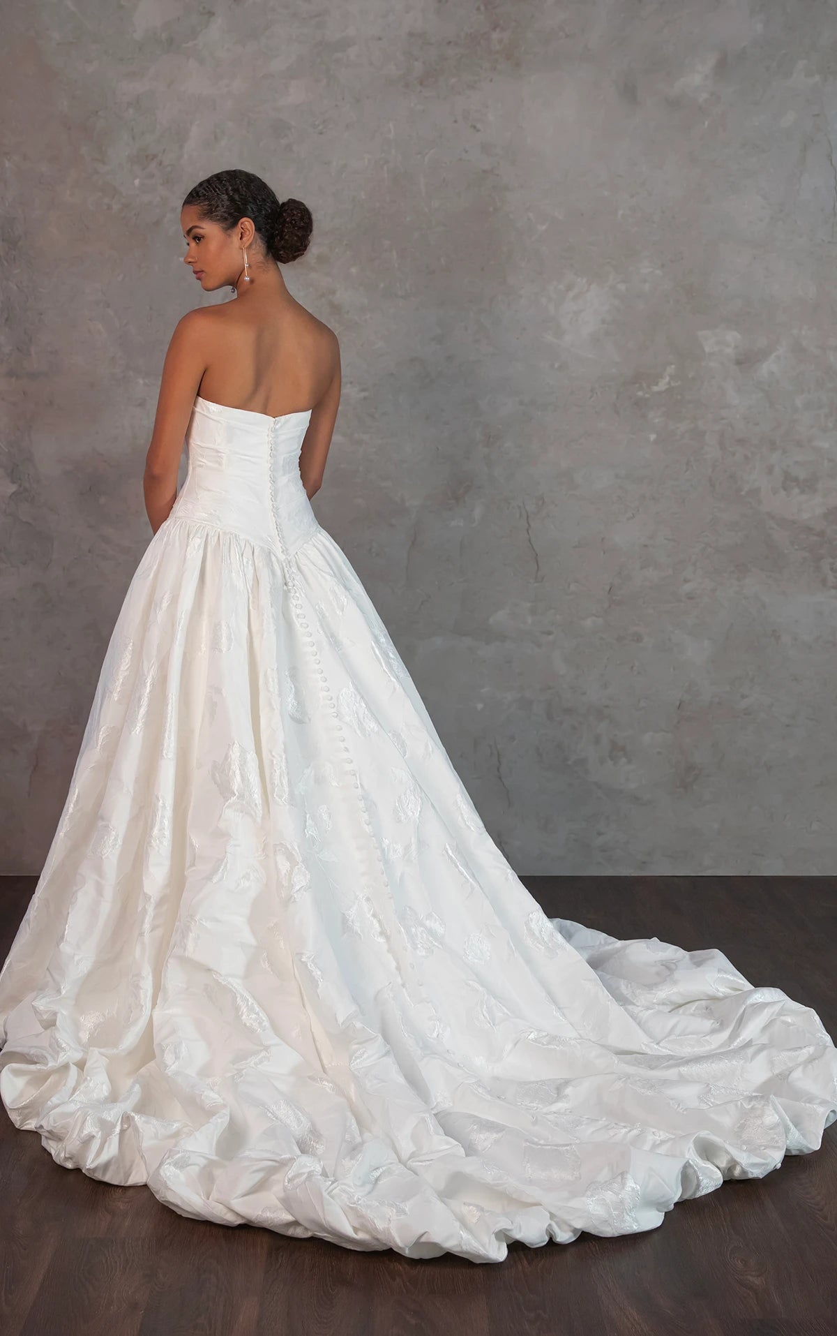 Style D4325 brings a modern fairytale to life with its runway-ready design and timeless romance. The strapless scoop neckline bodice is elegantly ruched in luxurious taffeta, creating a sculpted and sophisticated look. A dropped waistline enhances the silhouette, offering a dreamy and fashion-forward appeal. In the back, a classic row of fabric-covered buttons trails from neckline to hem, adding a touch of vintage elegance. From the waist, a voluminous ballgown skirt with a statement bubble hem sweeps the floor, delivering an ethereal and dramatic effect. Balancing contemporary design with classic bridal charm, this ultra-romantic wedding gown is also available in plus sizes.