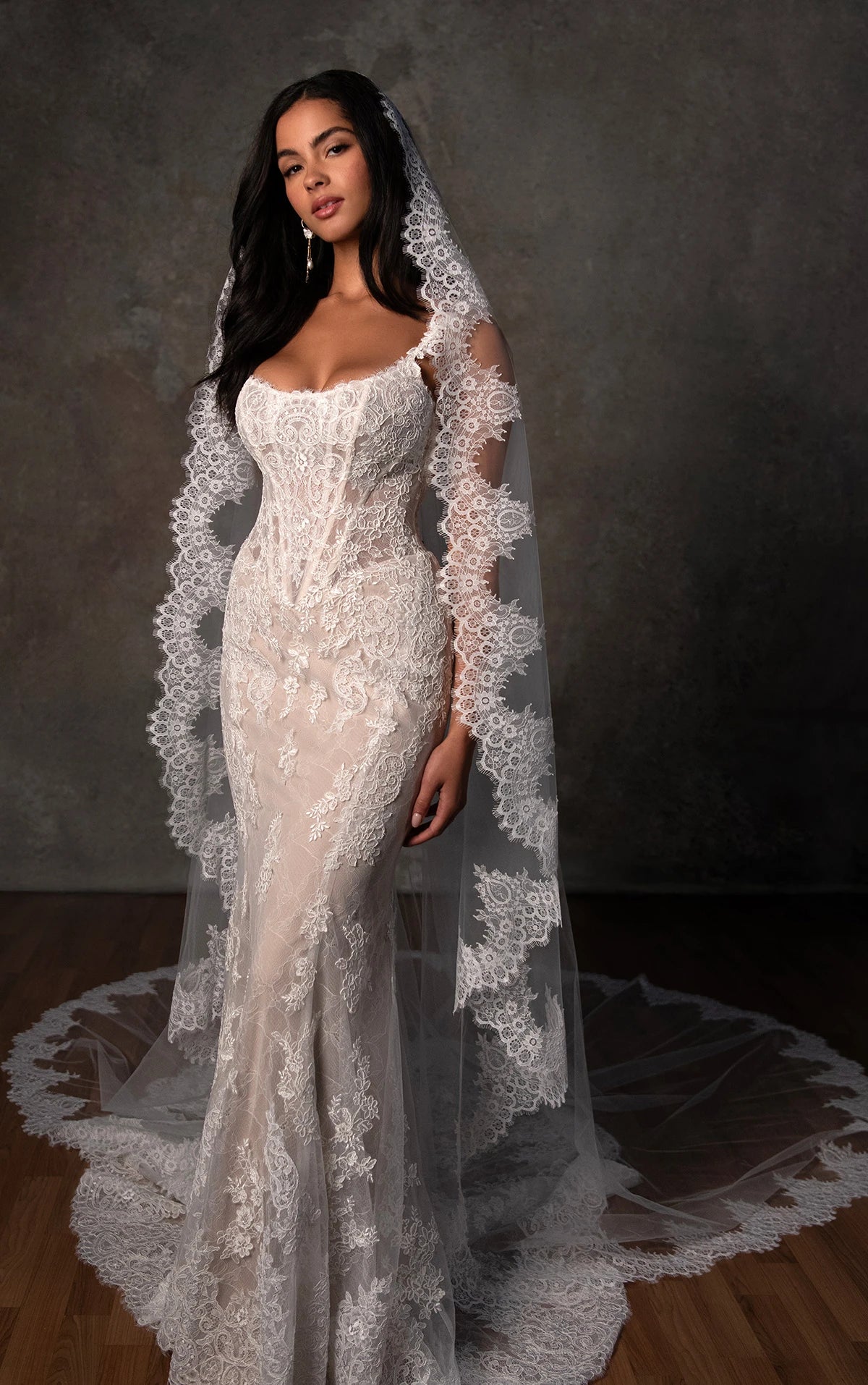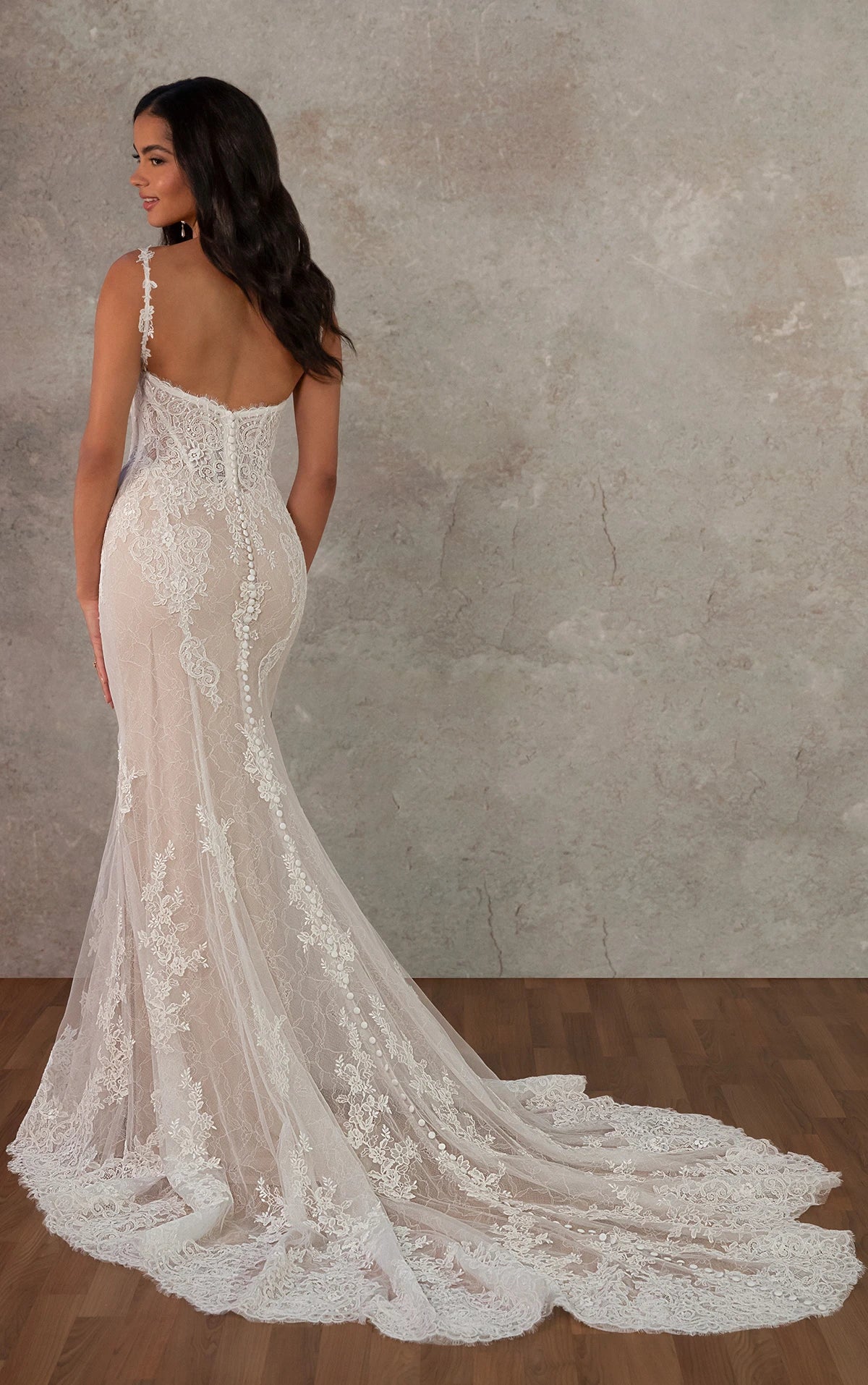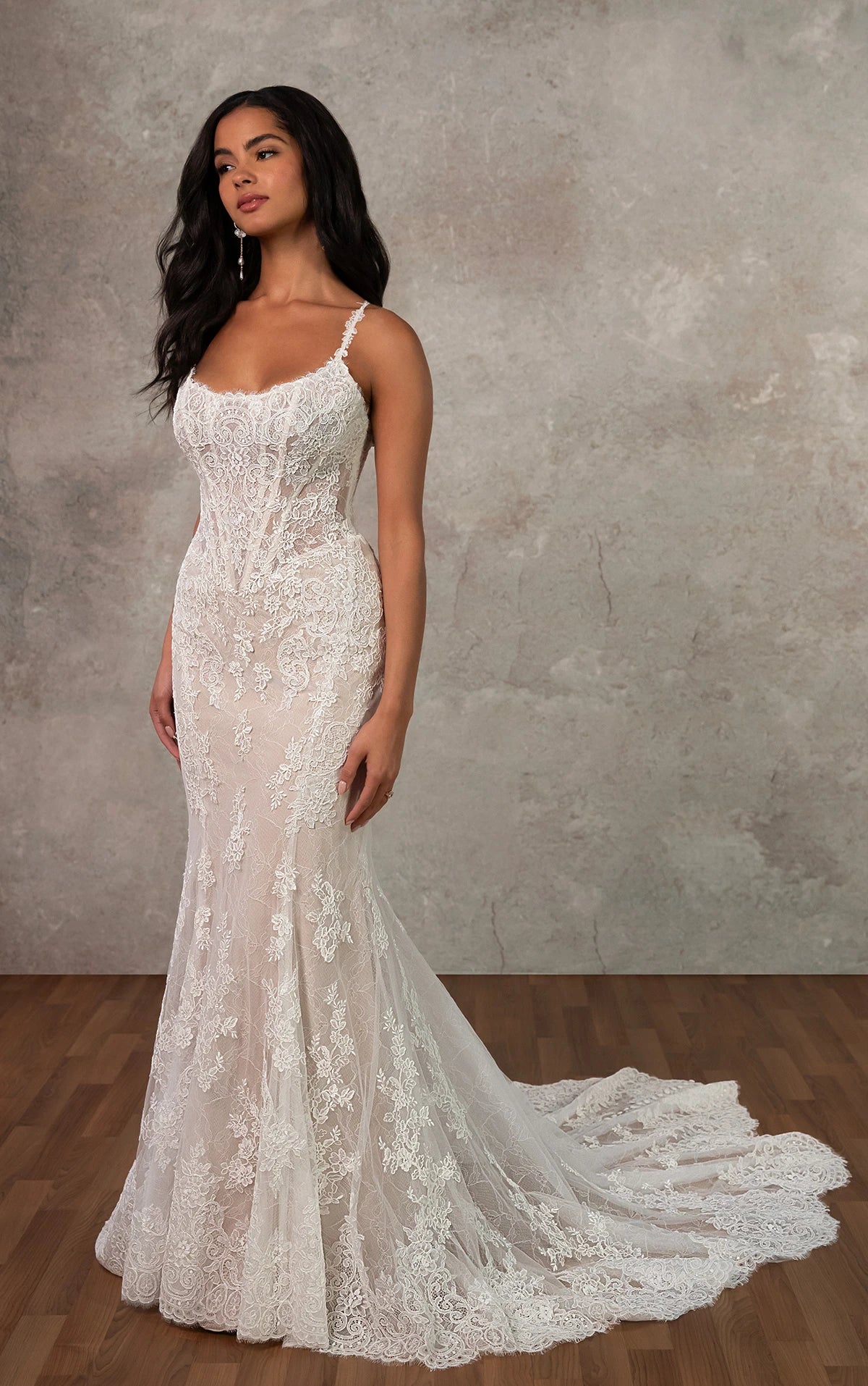Style D4437 is a romantic revival of old-world elegance, blending vintage-inspired details with a refined silhouette. Crafted in lace and tulle, this fit-and-flare gown features a soft scooped neckline with lace-shaped straps and a structured bodice with corset boning for subtle definition. A delicate Chantilly lace underlay adds texture beneath matte floral lace appliqués, while the Basque waist elongates the frame with a nod to classic design. The look finishes with a scalloped lace-shaped train, offering a dramatic and graceful finish for the bride drawn to timeless craftsmanship and beauty.