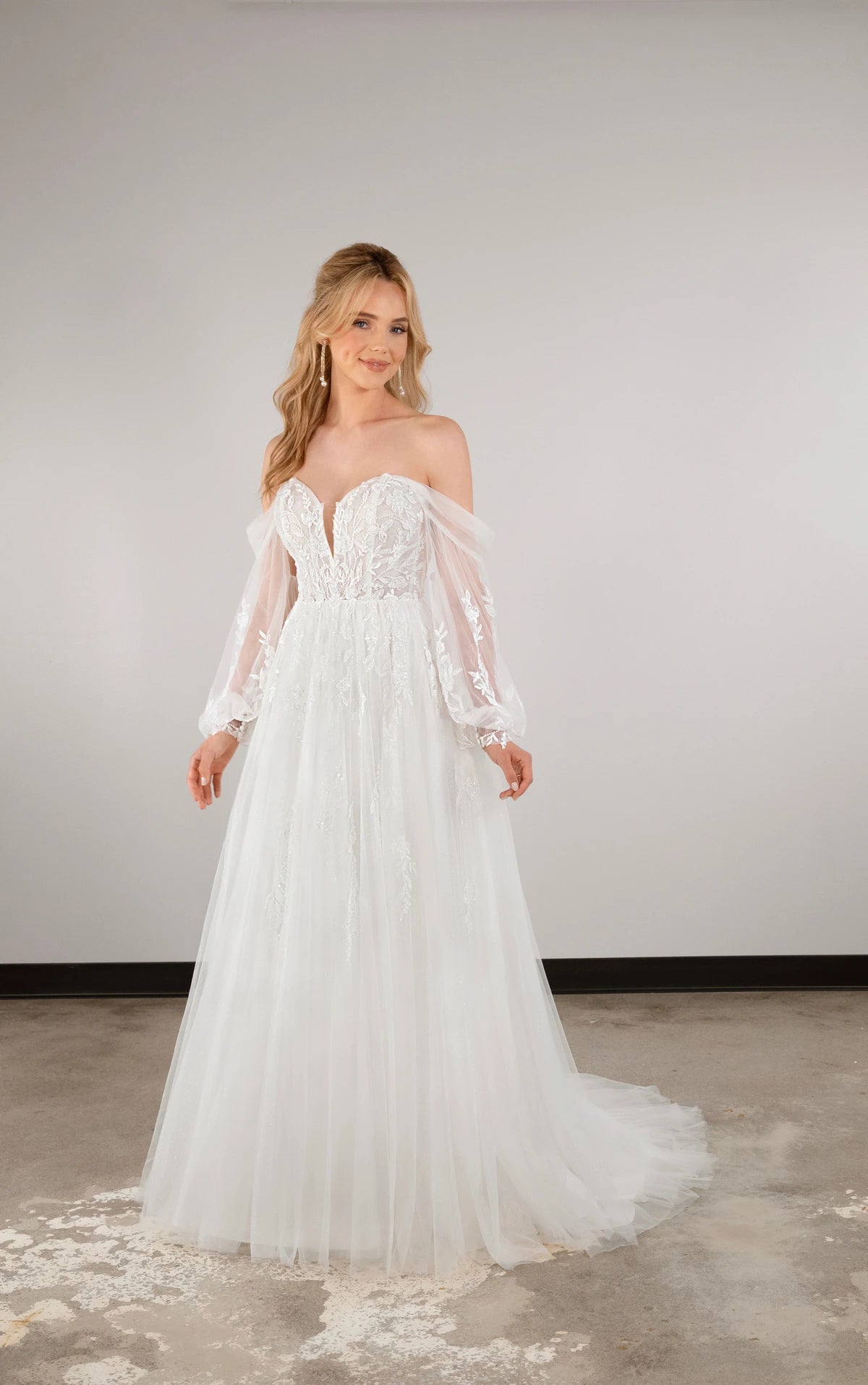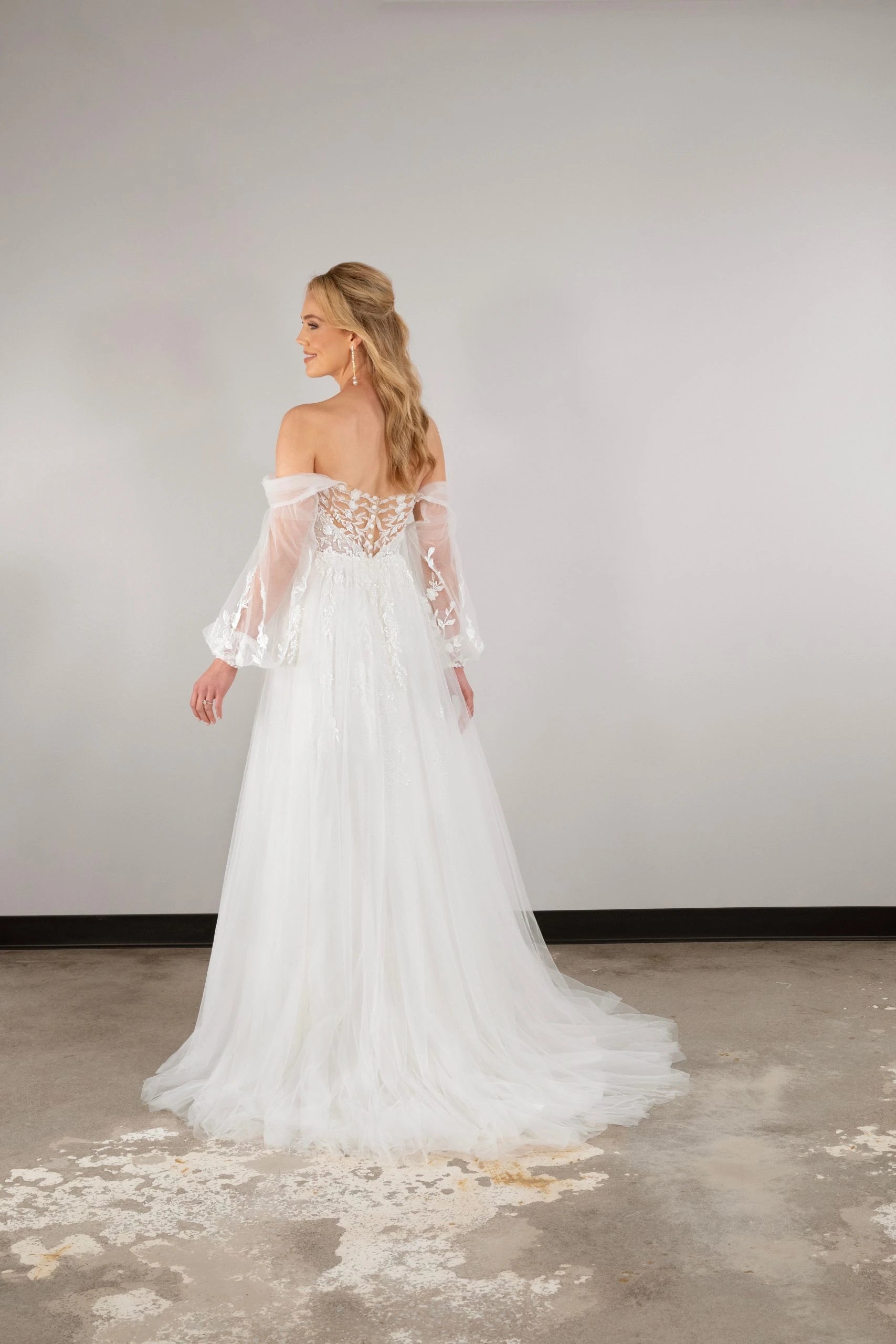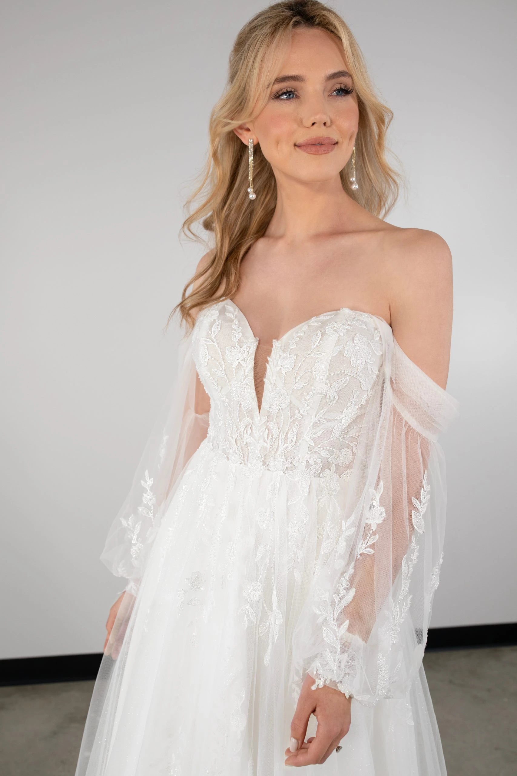 The soft A-line silhouette of Style D3906 sparkles in botanical leafy lace and glitter tulle. From detachable blouson sleeves, a strapless sweetheart neckline accentuates the figure and frames the fitted sheer bodice. Delicate glittering tulle lace catches the light with every movement as the soft A-line skirt descends from the natural waist to form a dreamy, romantic silhouette. For a timeless wedding dress with boho-inspired details, this A-line wedding dress delivers a breathtaking bridal look for that memorable day.