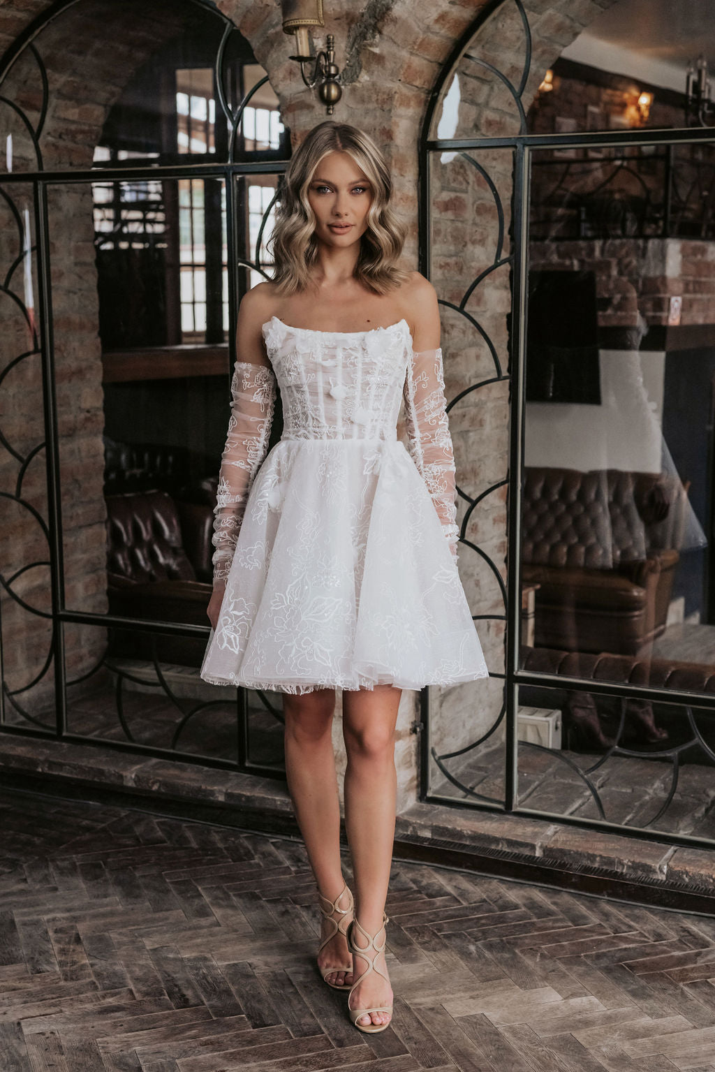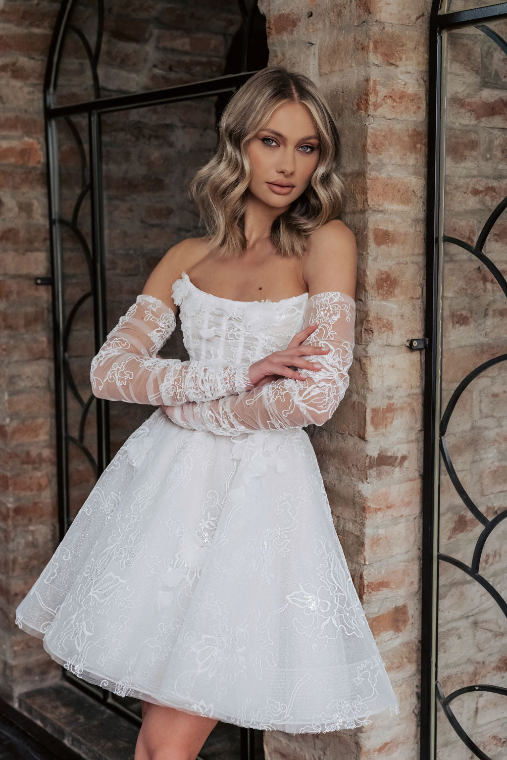 This a-line cocktail gown has the sparkle and shine from glitter tulle and sequins. With embroidered florals that flow throughout the dress and the sleeves, the 3D floral appliques.