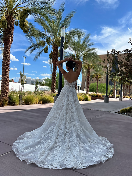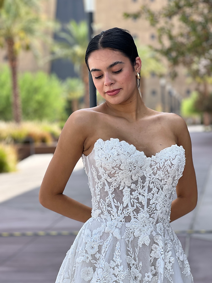 Beautiful A-line ball gown dress with lace appliqué, beadings, and off-the-shoulder sleeves. The intricate detailing and the flowy silhouette make it perfect for a sophisticated bridal look.