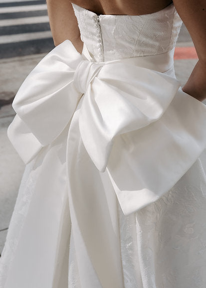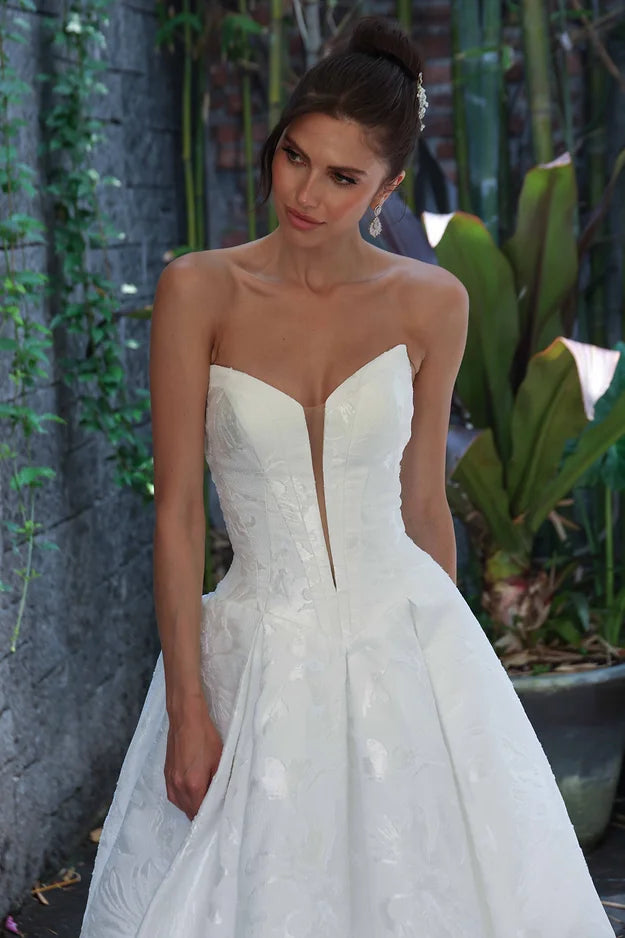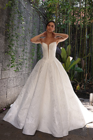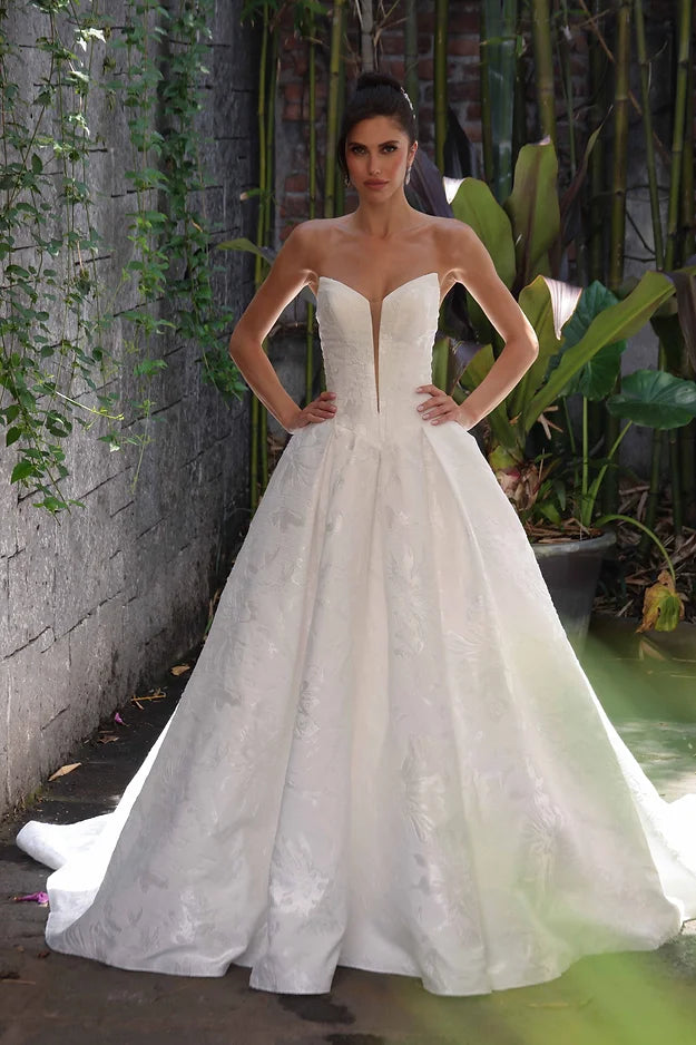 Features an elegant A-line ballgown crafted from jacquard fabric, which showcases subtle textured patterns throughout. The dress is strapless with a plunging neckline and a structured bodice that adds a modern touch to the timeless design. The skirt flows gracefully, creating a voluminous and sophisticated silhouette.
