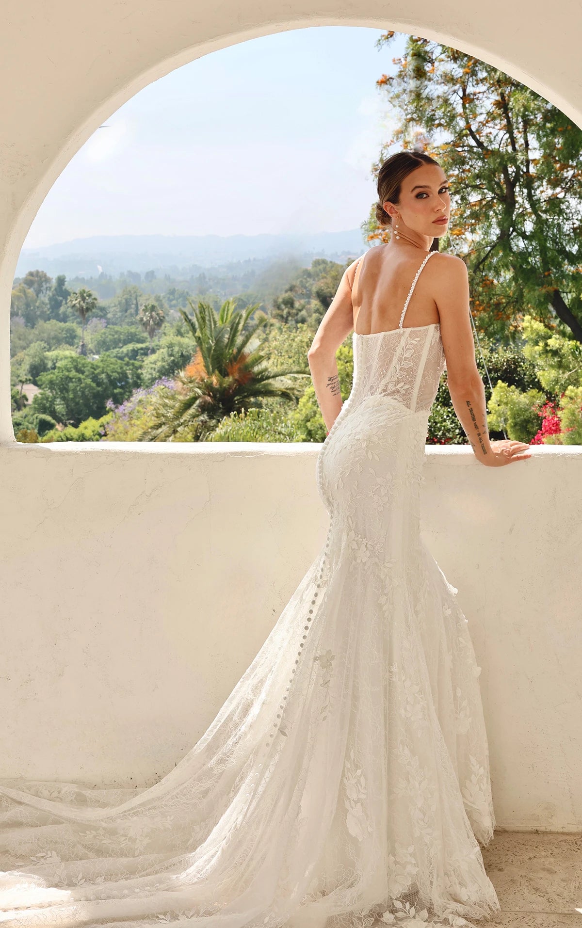 Embracing modern romance, this lace and tulle fit-and-flare wedding dress offers a captivating blend of elegance and allure. From pearl spaghetti straps, Style 1854 features a flattering sweetheart neckline and corset bodice, available in lined or unlined options. This gorgeous gown also offers customizable options for the back detail: classic fabric-covered buttons or a sexy tulle tie-up detail. From the Basque waist, a fitted skirt hugs the hips before softly flaring into a lacy sweeping train, embodying a timeless balance of sexy sophistication and romantic charm. With 3D florals and pearl embellishments over sparkling glitter tulle and customizable couture options, this sexy fit-and-flare wedding gown is ready to make a statement down the aisle.