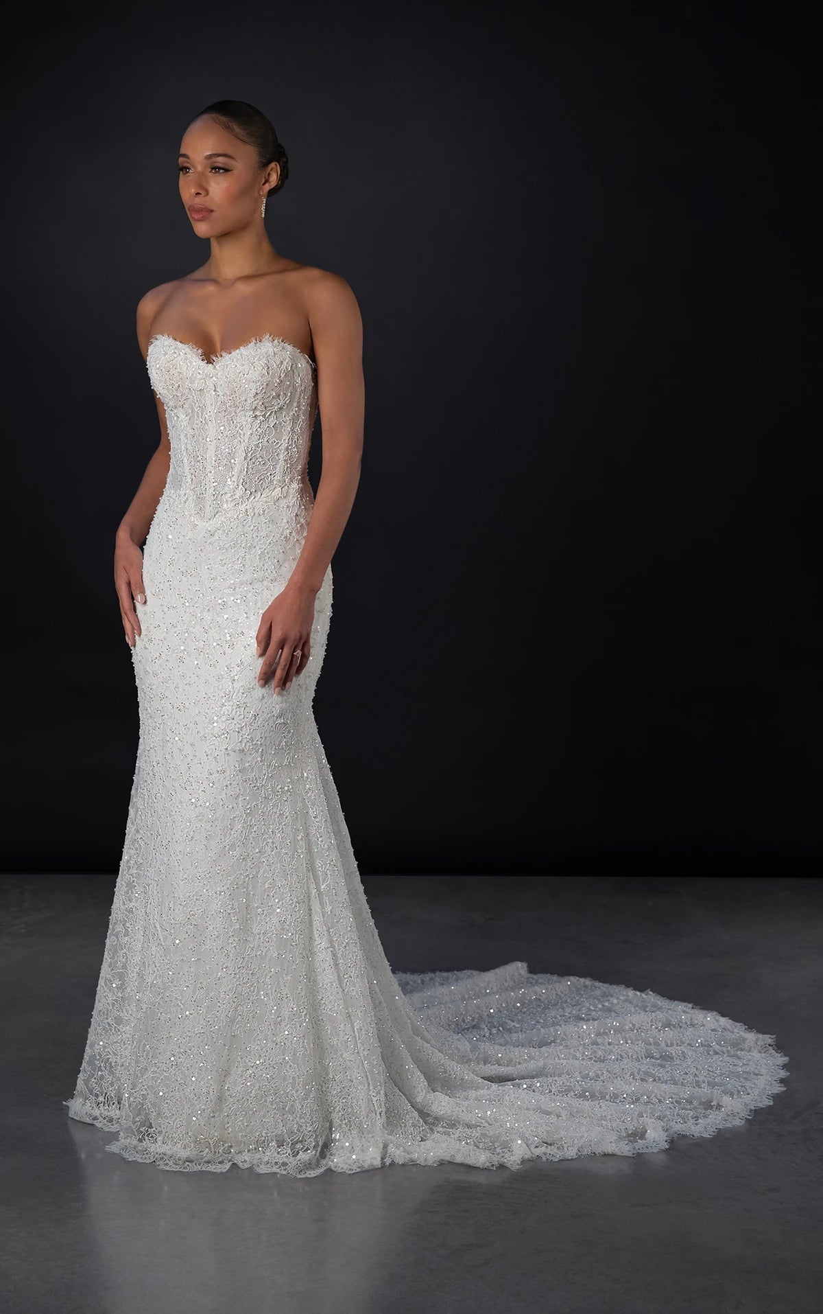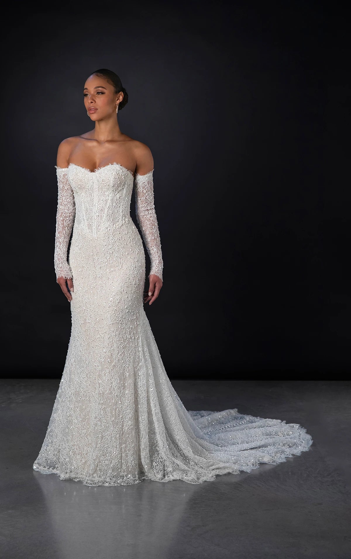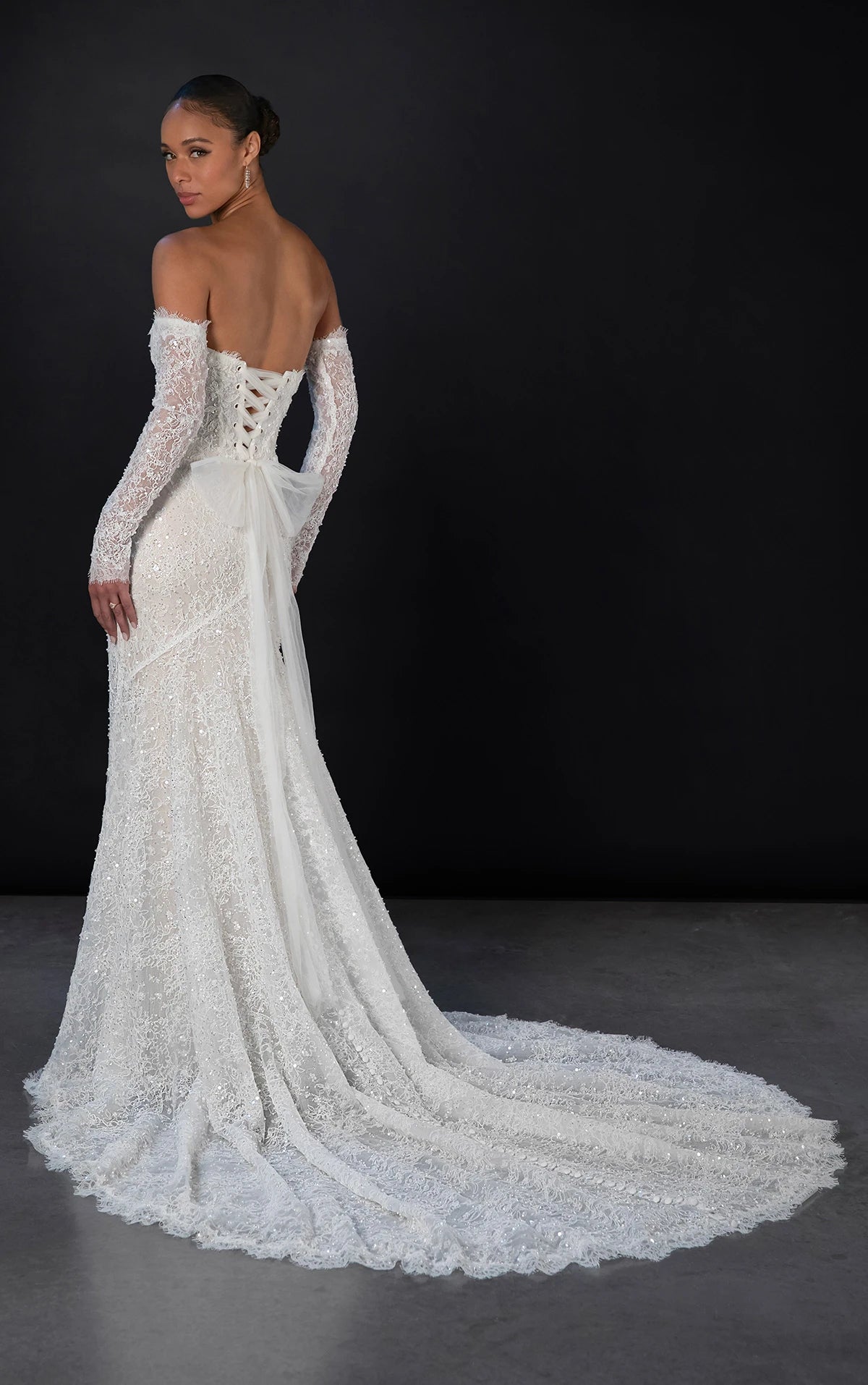 Effortlessly blending tradition with modern allure, Style 1860 catches every eye down the aisle with its sexy design and exquisite couture details. Detachable long sleeves, finished with fabric-covered buttons at the wrists, complement a strapless sweetheart neckline bodice with exposed boning, both adorned with delicate eyelash lace trim. The allover lace column silhouette, embellished with 3D florals, sequined accents and pearl embellishments over glittering tulle hugs every curve, ensuring a radiant descent down the aisle. Sparkling details and captivating design combine for a one-of-a-kind sexy column wedding dress.
