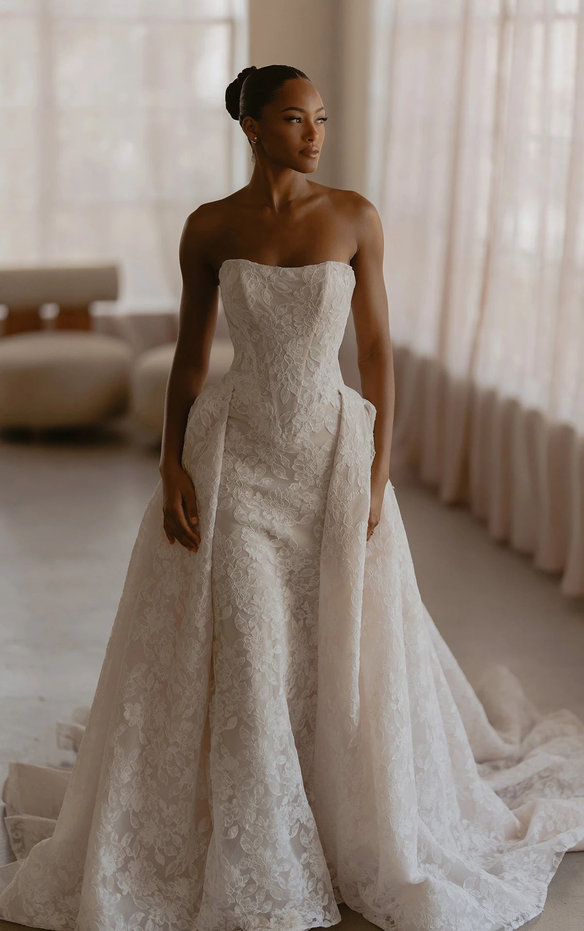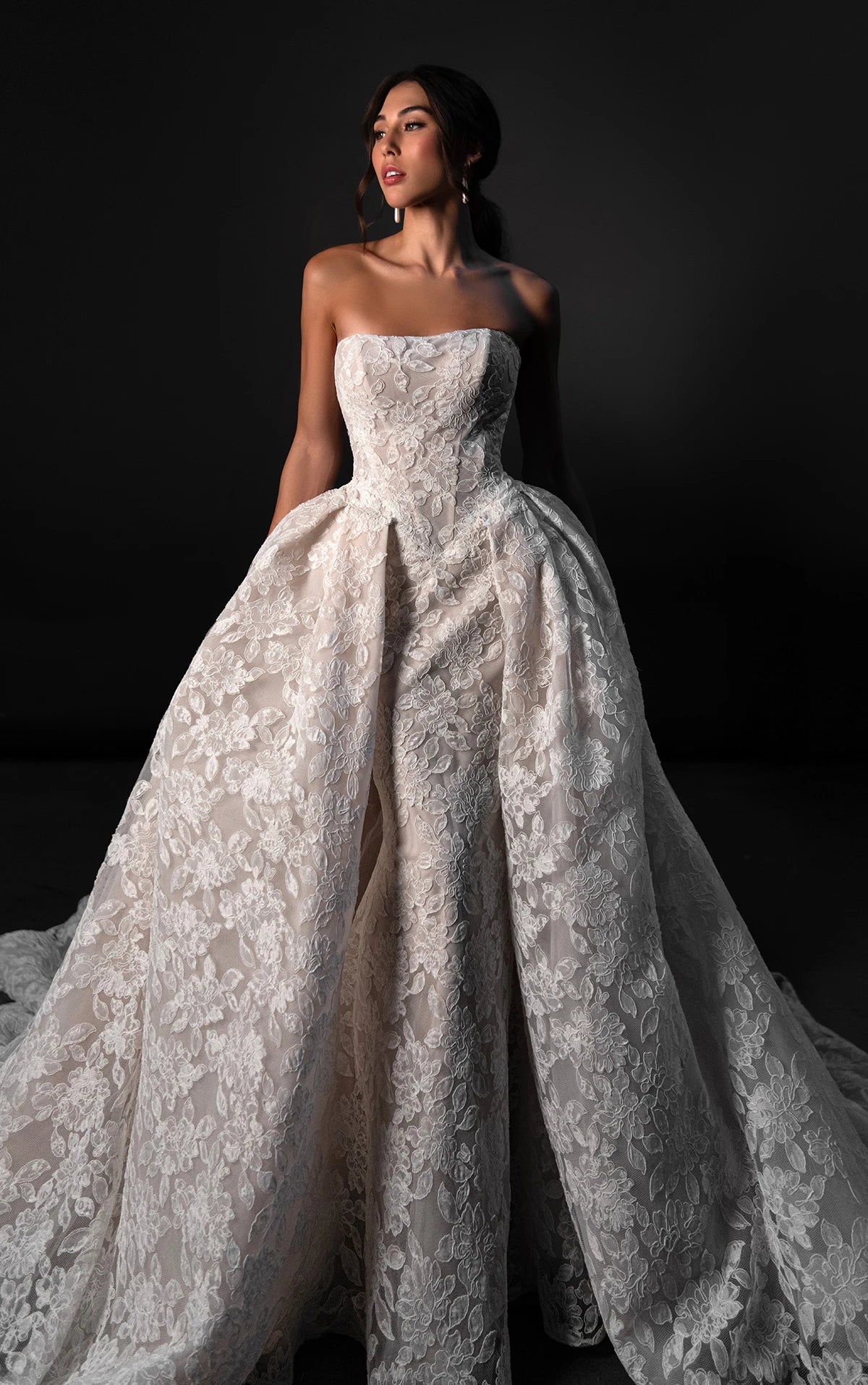 Romantic, sophisticated and undeniably couture, Style ML1986 is a strapless fit-and-flare bridal gown crafted in layers of lace and tulle. The straight-across neckline introduces a structured, fully lined bodice adorned with intricate corded lace, offering timeless elegance. From the subtle basque waistline, the gown highlights the figure in a striking sculpted fit-and-flare silhouette. For brides craving extra impact, a detachable overskirt adds breathtaking volume and versatility, transforming the gown from sleek sophistication to grand, unforgettable drama.