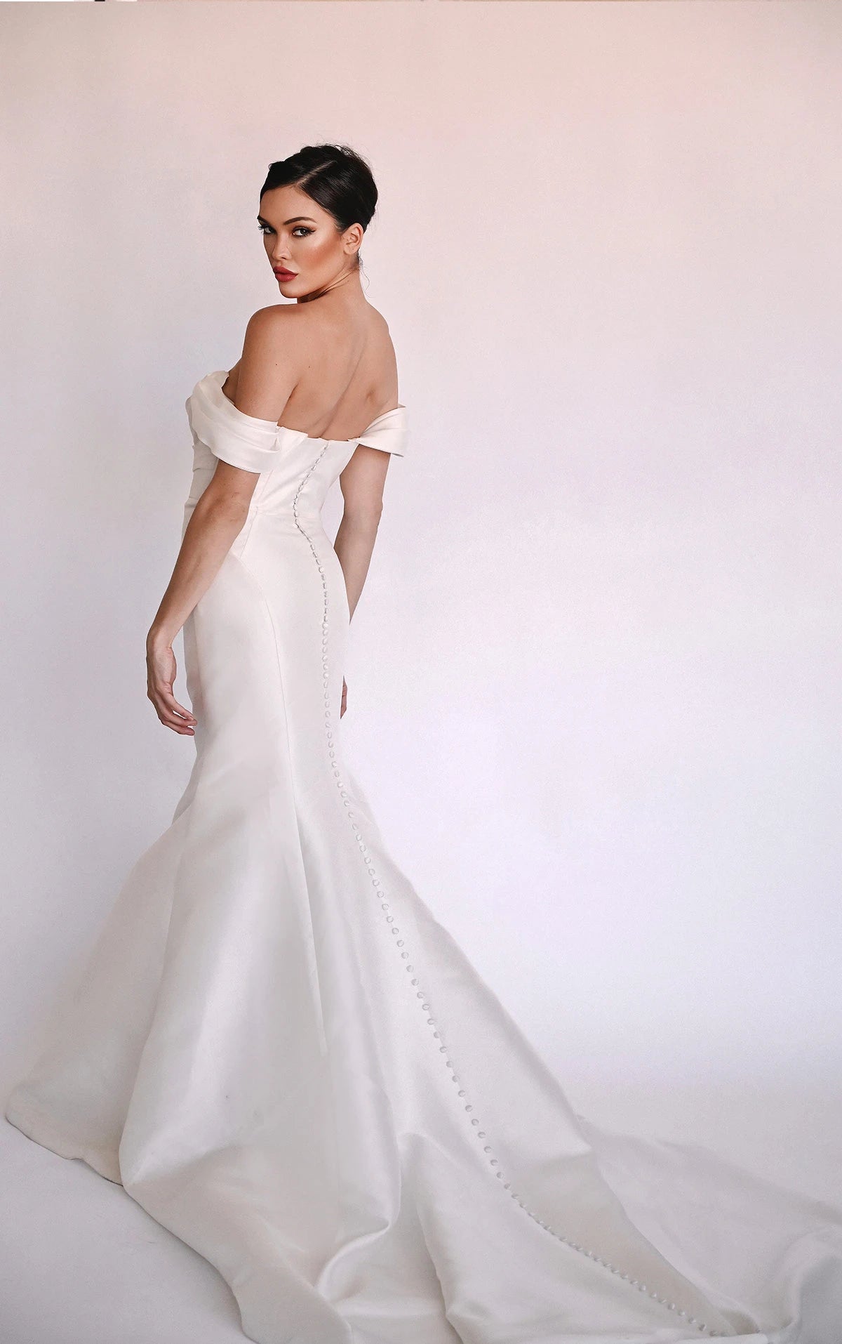 Style 1486 is an exquisite modern wonder of elegant couture design. A modernized sweetheart neckline gives a contemporary lens to a romantic classic. The soft pleating and asymmetrical bodice offer an effortless allure to an impeccably tailored look made even more glamorous by the detachable off-the-shoulder straps. This chic fit-and-flare silhouette is accentuated by sophisticated contour seaming and a sleek choice of luxurious fabrics in Matte Mikado or Silk Zibeline. This contemporary and glamorous wedding dress of couture construction is a fashion-forward look for the modern bride.