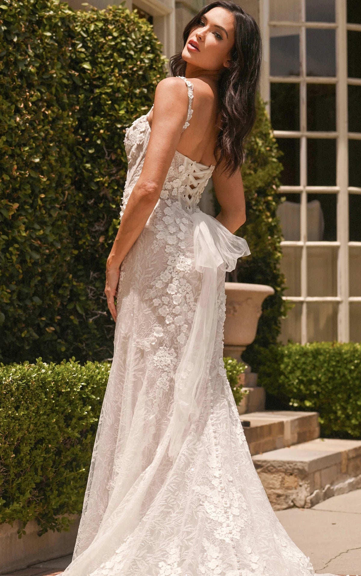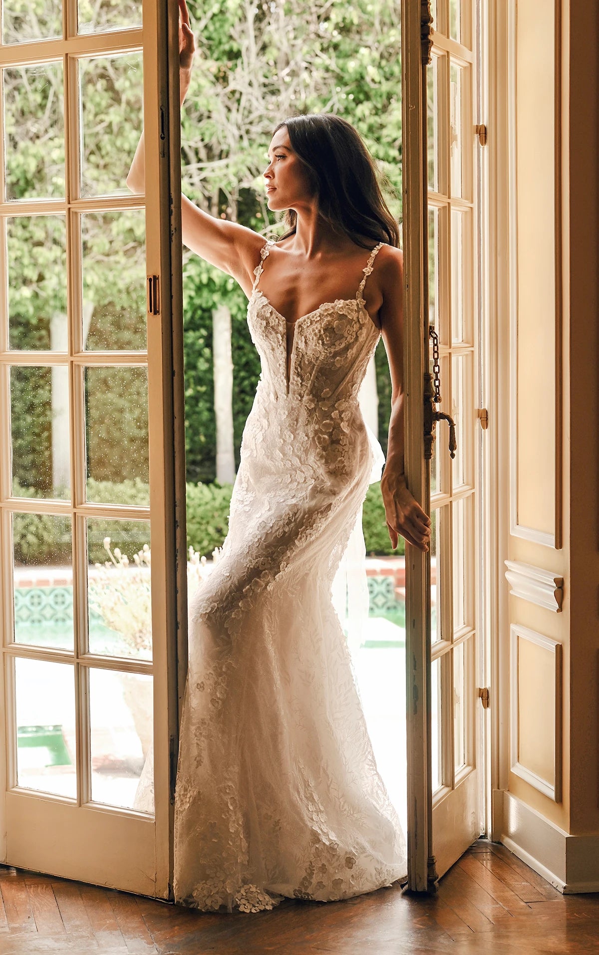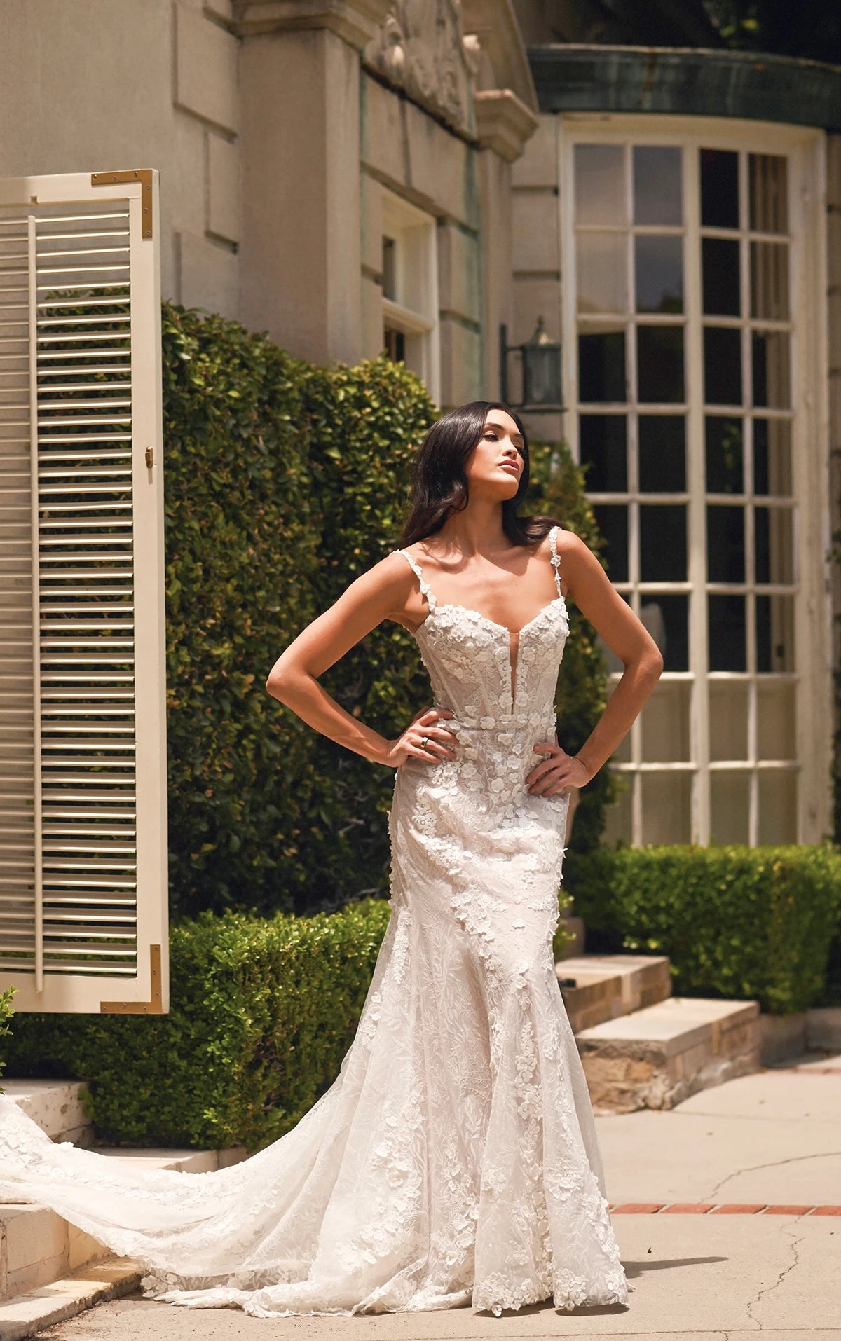 Find the perfect balance of romantic yet glamourous bridal style in this floral lace fit-and-flare wedding dress with a layer of botanical glitter lace. Style 1699 features delicate lace spaghetti straps that attach to the plunging sweetheart neckline, the bodice is cinched and tied in the back for a vintage romantic bridal look. Opulent 3D floral embellishments bloom across the figure-flattering silhouette from bodice to hem as the fitted skirt skims the hips before flaring into a dramatic lace shaped train for a couture finish. This wedding gown is also available in plus sizes.