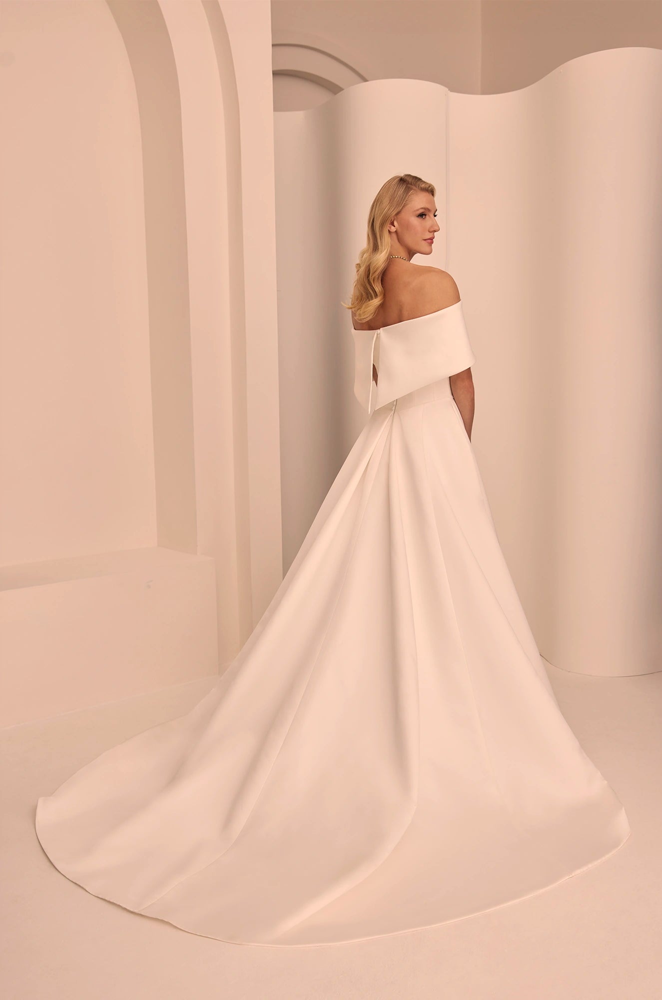 Elegance meets versatility in Style M2513. Crafted in Duchesse Satin, this gown boasts a strapless bodice and a flattering scoop neckline. A detachable portrait collar adds a touch of regal sophistication, offering brides the option of two distinct looks for their wedding day. Elevated by a wrap skirt with a discreet side slit and practical pockets, this design effortlessly harmonizes style with functionality, tailored to meet the needs of the contemporary bride.