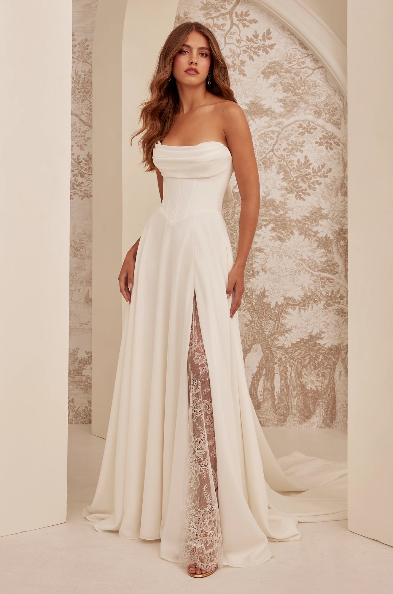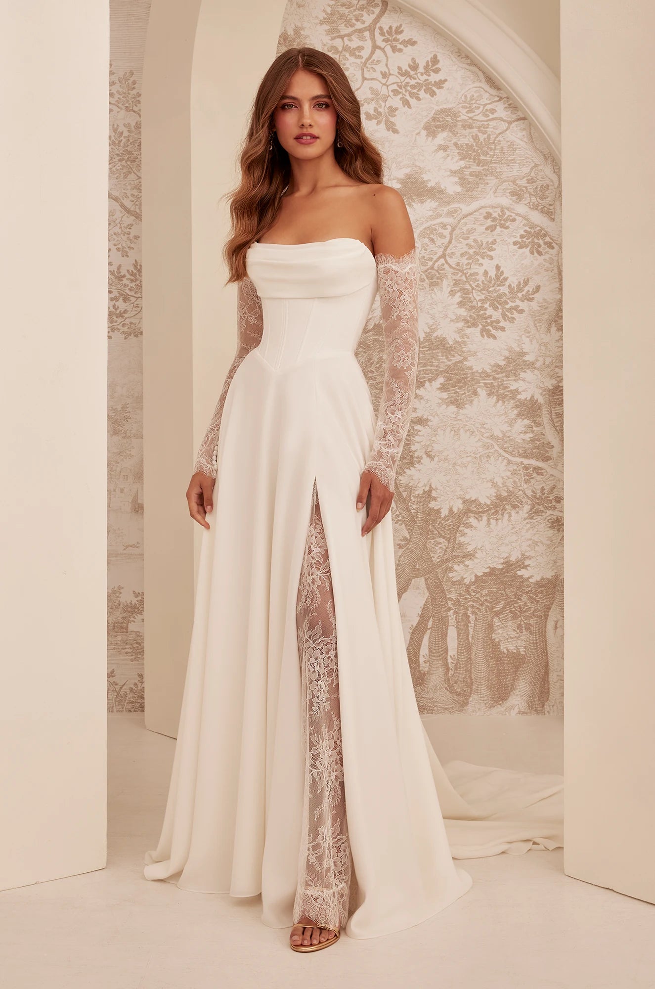This stunning gown features a Crêpe corset bodice with exposed boning and a draped neckline. Detachable Crêpe sleeves and separate long Chantilly Lace sleeves add elegance, while Chantilly Lace back panels enhance the look. Fabric-covered buttons run down the center back to the waist, and the full Crêpe circle skirt, with pockets and Chantilly Lace detailing at the slit, completes the sophisticated silhouette.