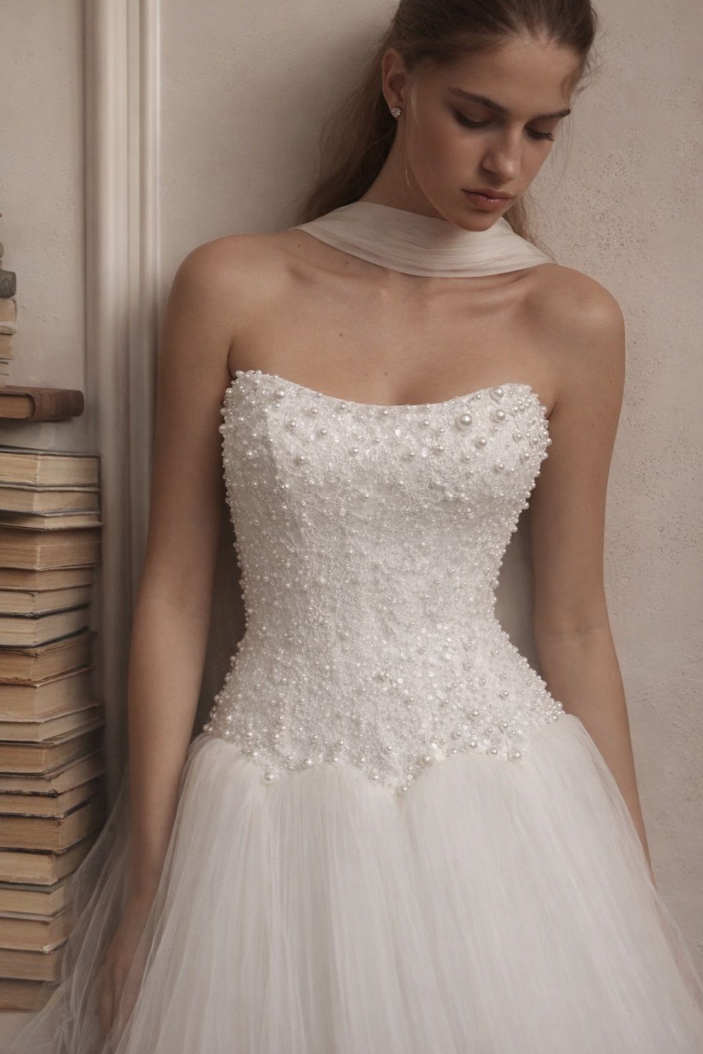 Stunning beaded bodice with pearl detailing. Full tulle skirt. Textured organza off the shoulder sleeves.