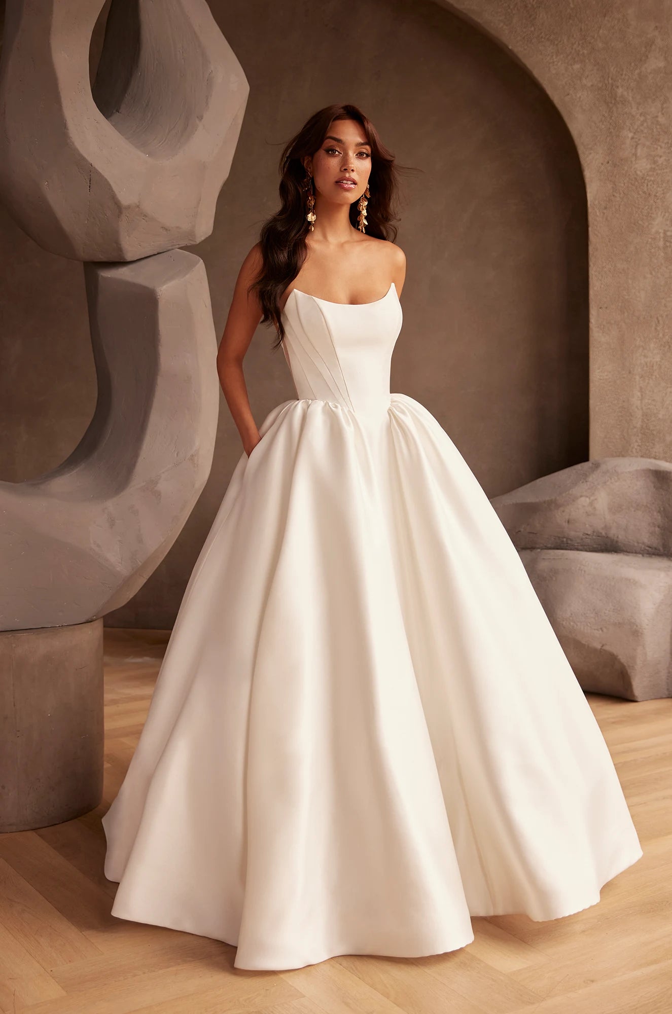 This gown captures classic elegance with its strapless Mikado bodice, featuring multiple princess seams and a graceful scoop neckline. The back bodice, made from Italian tulle, reveals exquisite exposed boning, while fabric-covered buttons trail down the center back to the waist, adding a touch of timeless charm. The full gathered ballgown skirt, complete with a sleek flat center front panel and practical pockets, creates a silhouette that is both majestic and refined.