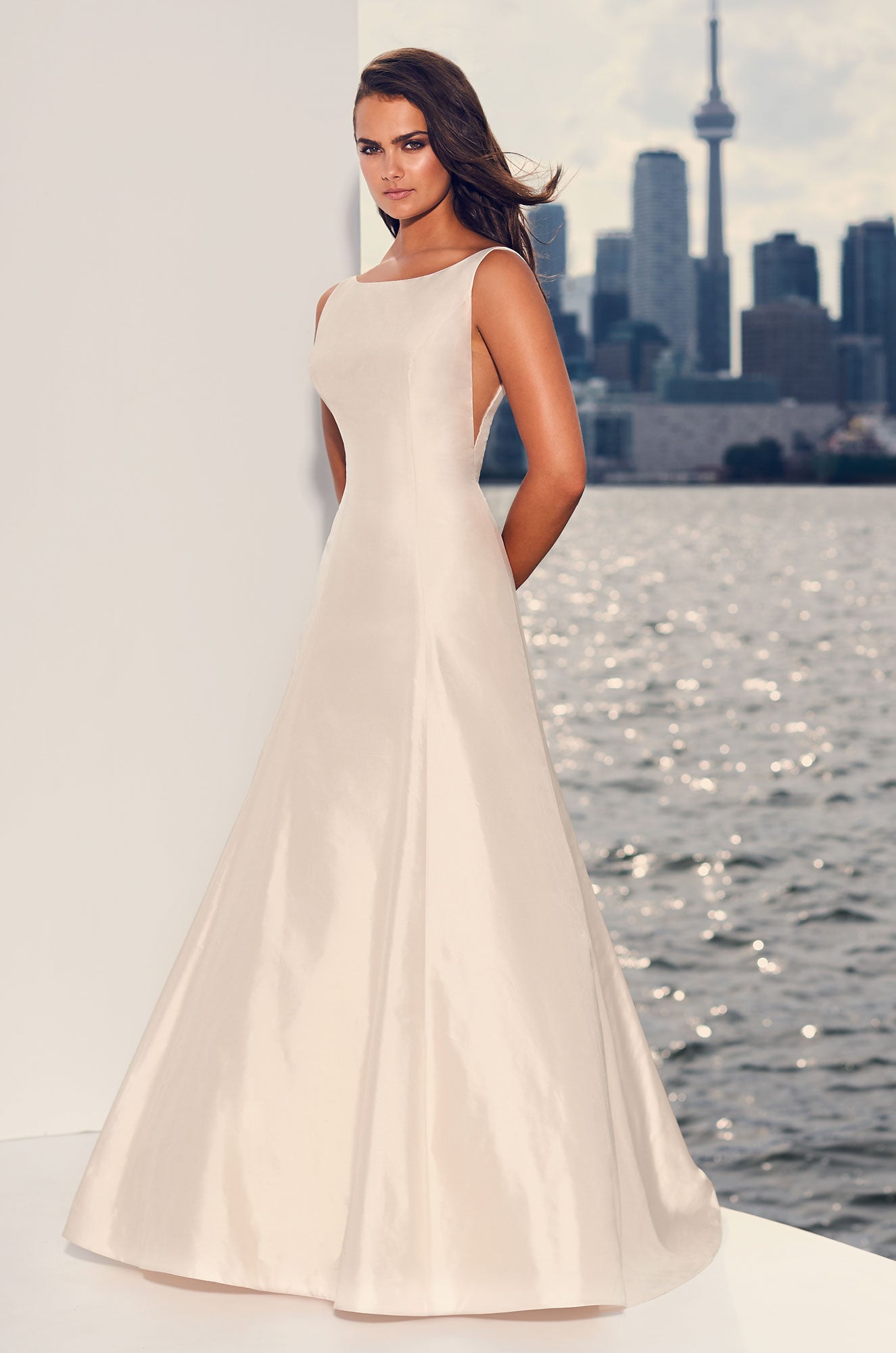 Silk Dupioni Wedding Dress. Silk Dupioni gown with bateau neckline and low back. V-shaped Italian Tulle inserts at side seams on bodice. Flared skirt fitted through hips with princess seams to hem.