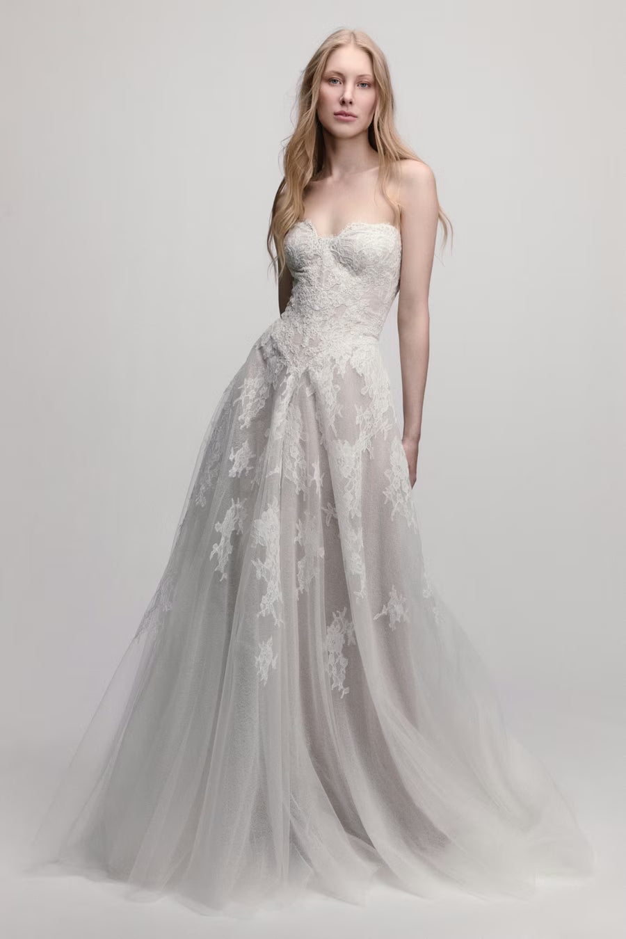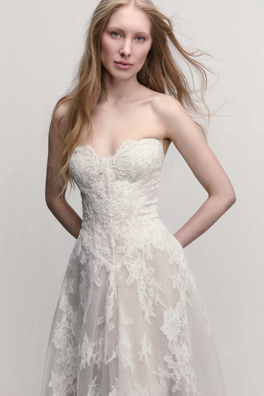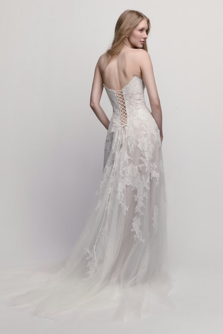 Midge is a vision in French-inspired Alençon lace, blending corded and uncorded textures for a sculptural romantic look. The strapless bodice is shaped with soft cups and edged in delicate scallops, perfectly placed to flatter. A drop Basque waist defines the silhouette while the lace-up back adds drama and adjustability. Layered lace placement sculpts the figure from every angle, finishing in a soft sweep train for movement and charm.